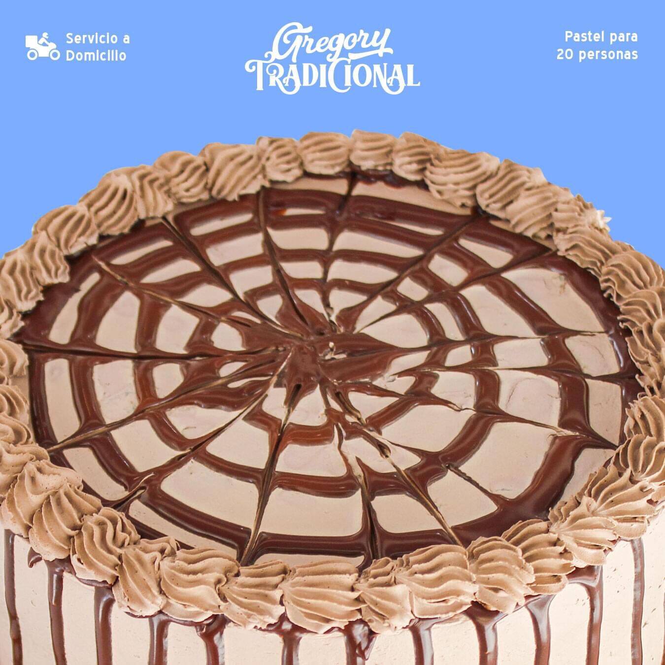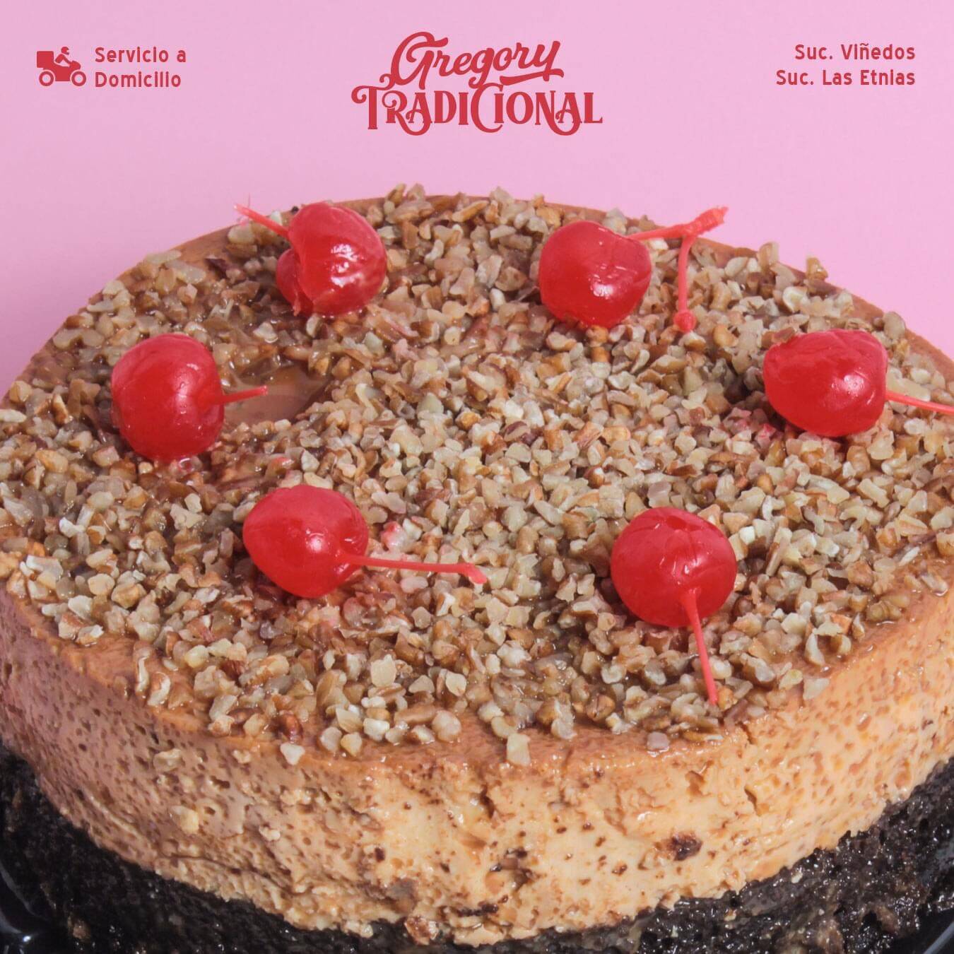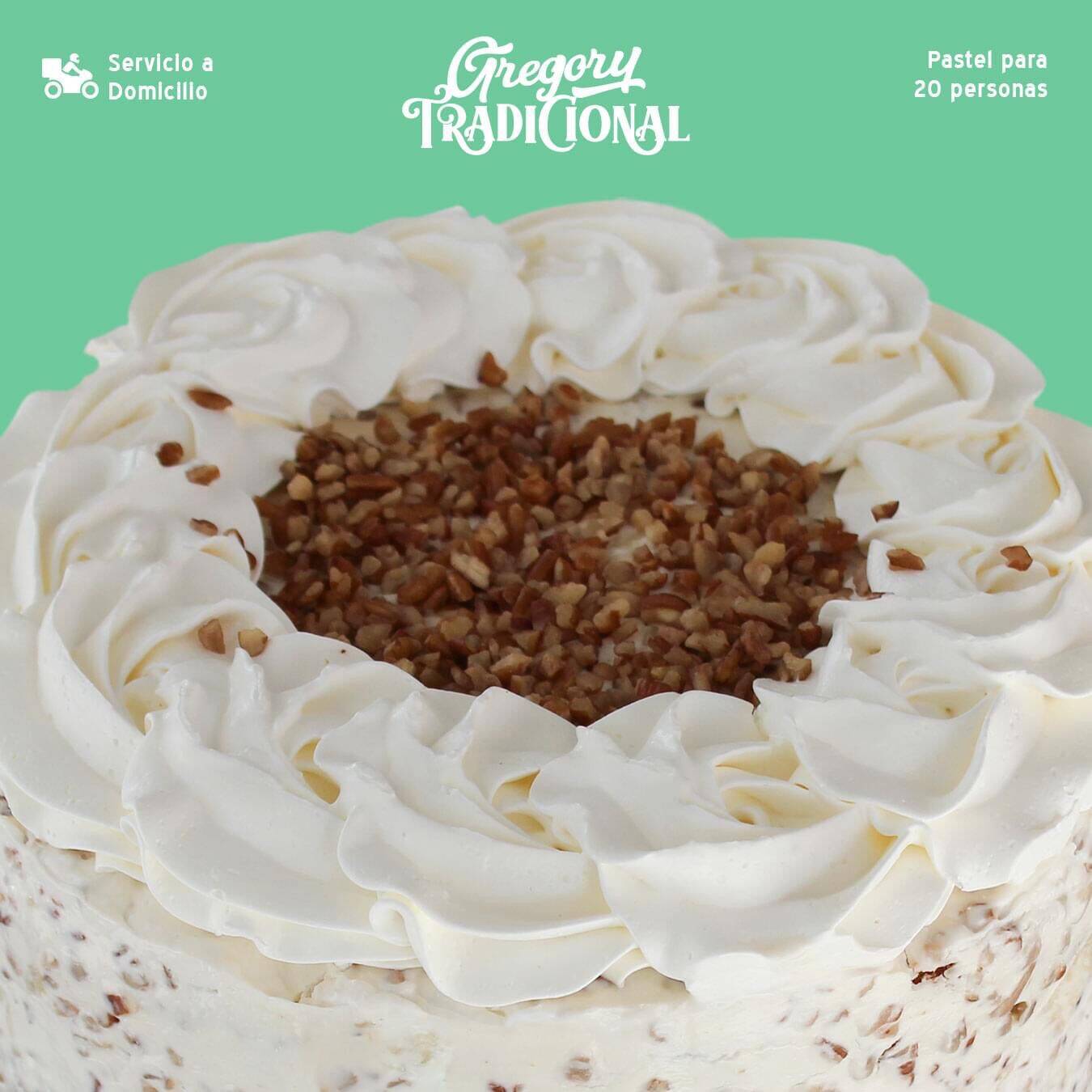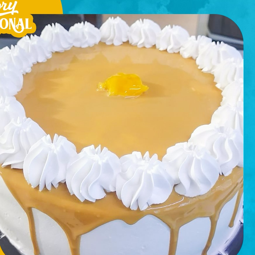 Pan esponja mojado con 3 leches, betun de vainilla, relleno de trocitos de duraznos y chorreado de cajeta. Para 12 porciones