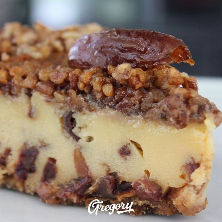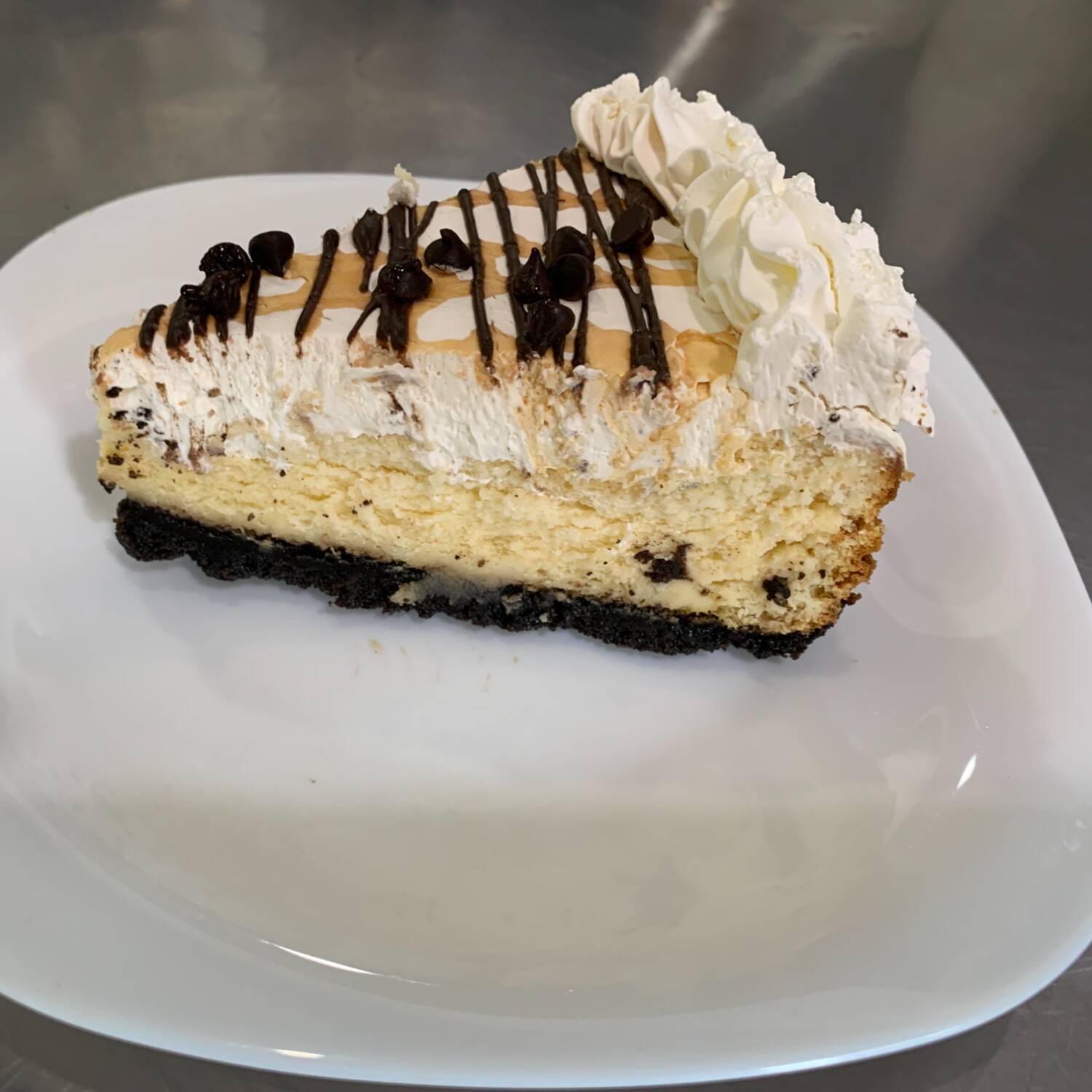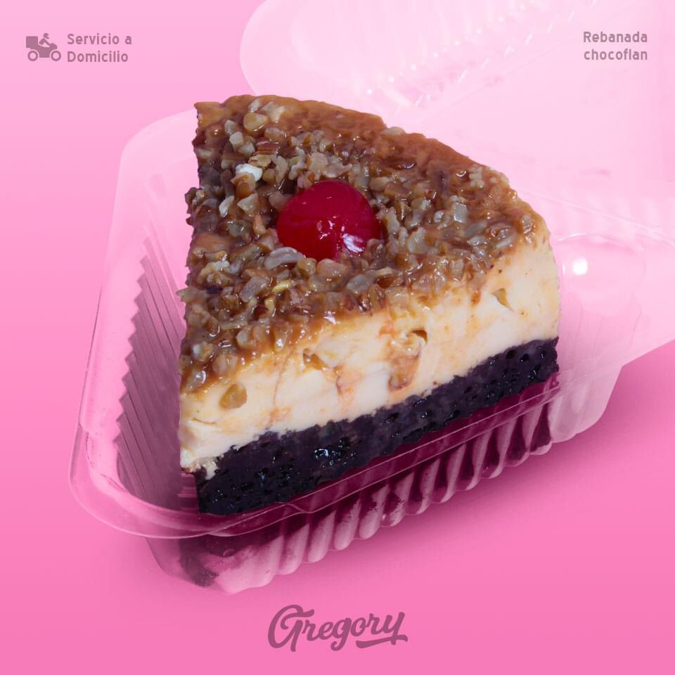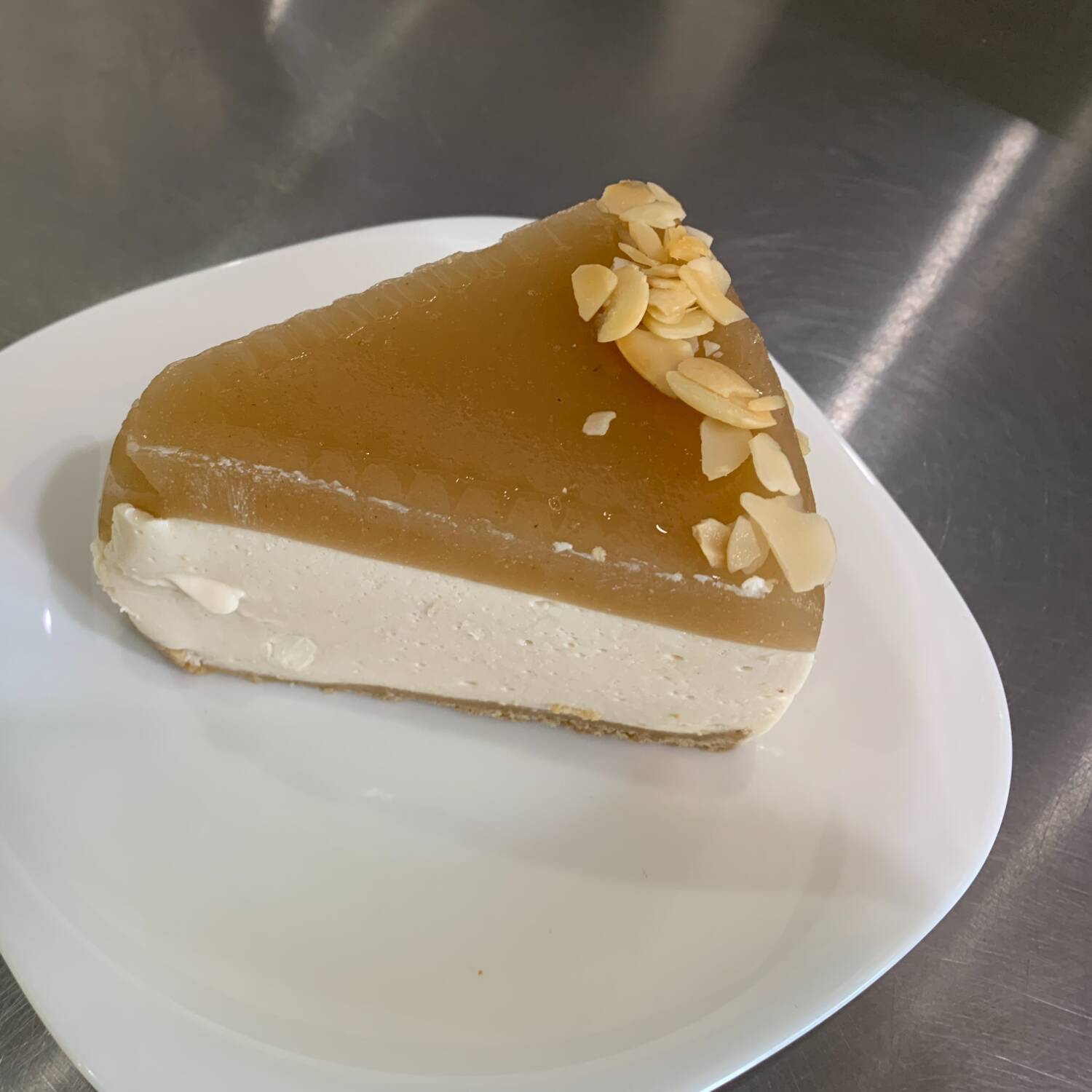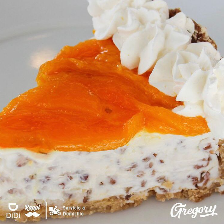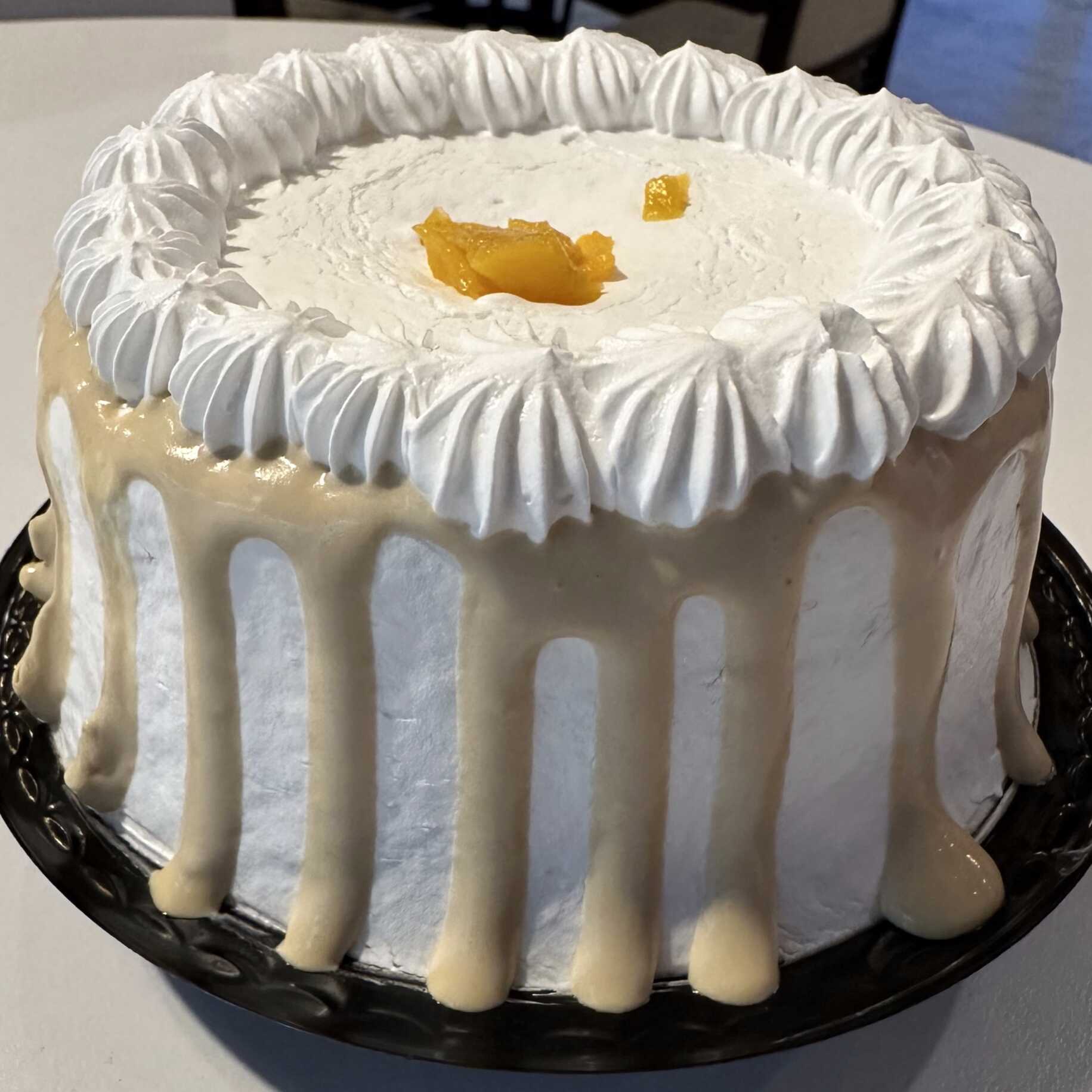 Pan esponja mojado con 3 leches, betun de vainilla, relleno de trocitos de duraznos y chorreado de cajeta.
