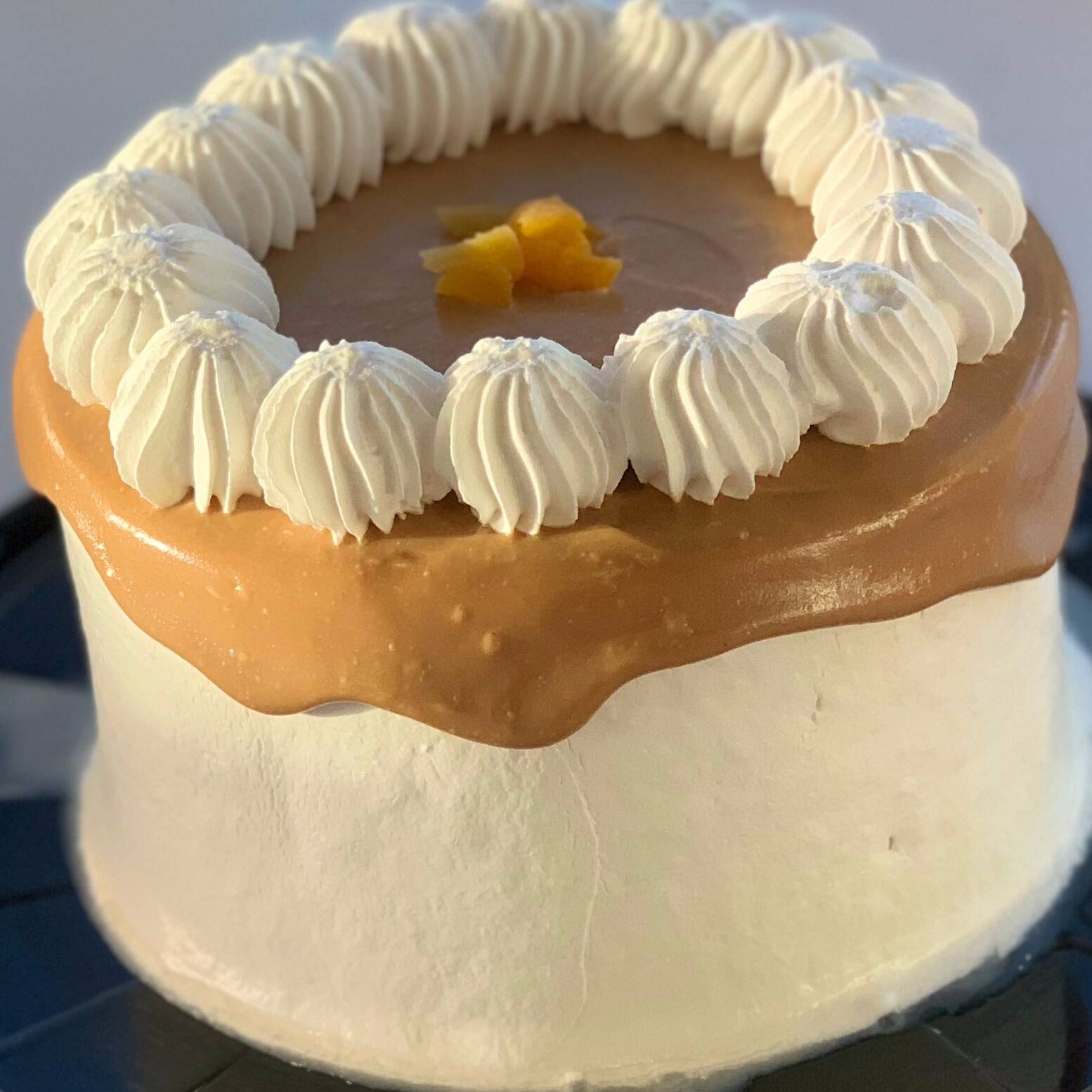 Pastel para 6 personas, pan esponja de vainilla mojado con receta de 3 leches, betún de crema sabor vainilla, relleno de trocitos de duraznos, y salsa de cajeta.