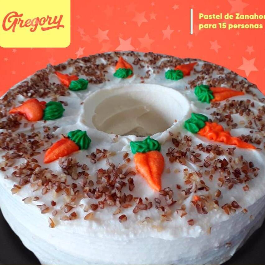 Pastel para 12 personas, pan de zanahoria con betún de queso crema sabor zanahoria y nuez arriba.