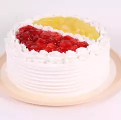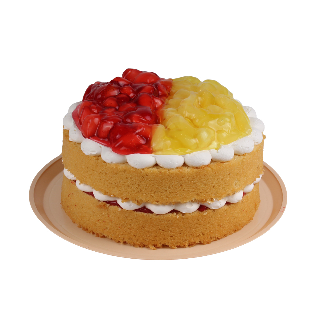 Pastel de vainilla con crema cremosa, mermelada de fresa, decorado fresa, piña y glase.