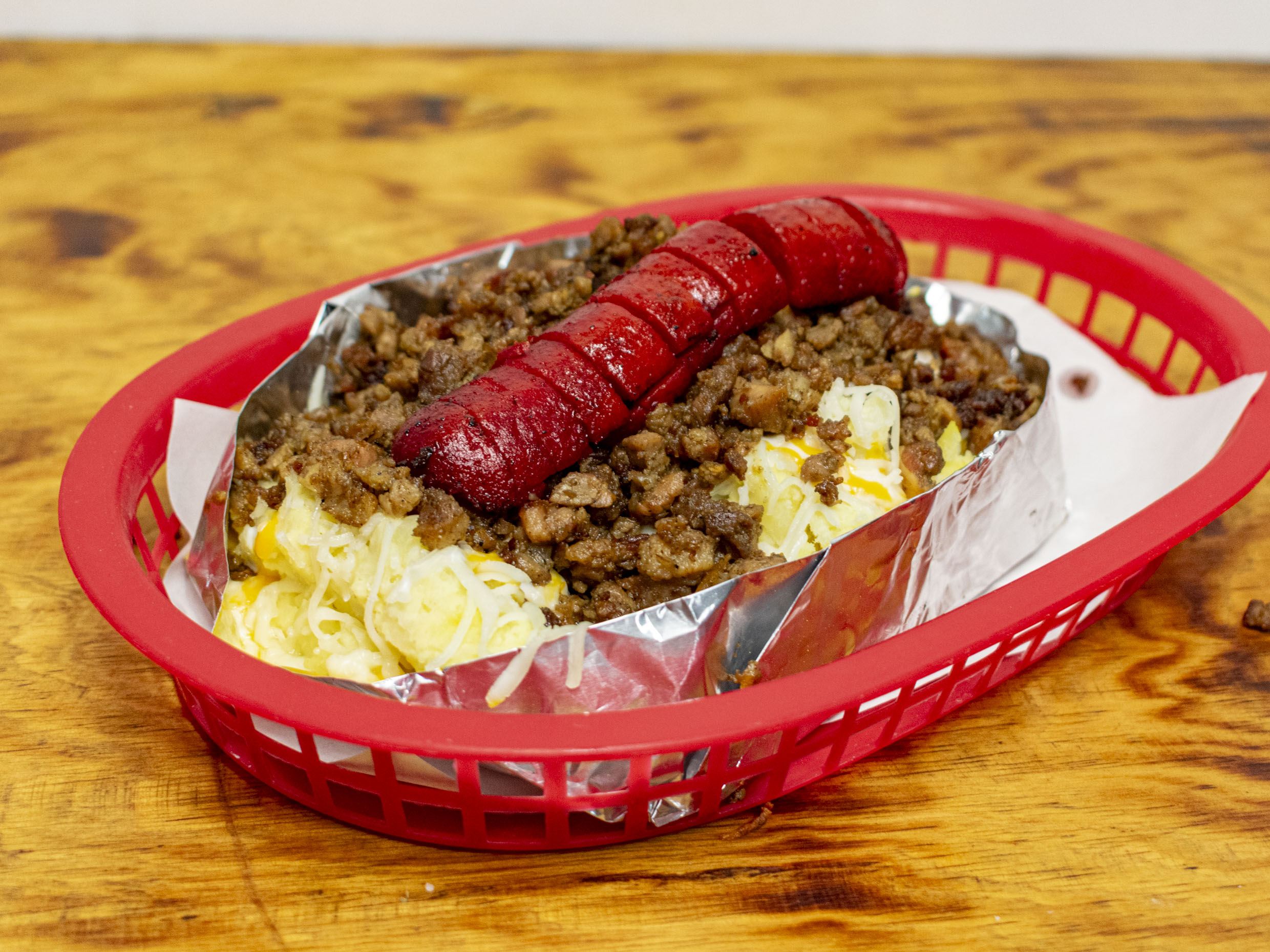 Tortilla, chistorra, cebolla, cilantro y limón.