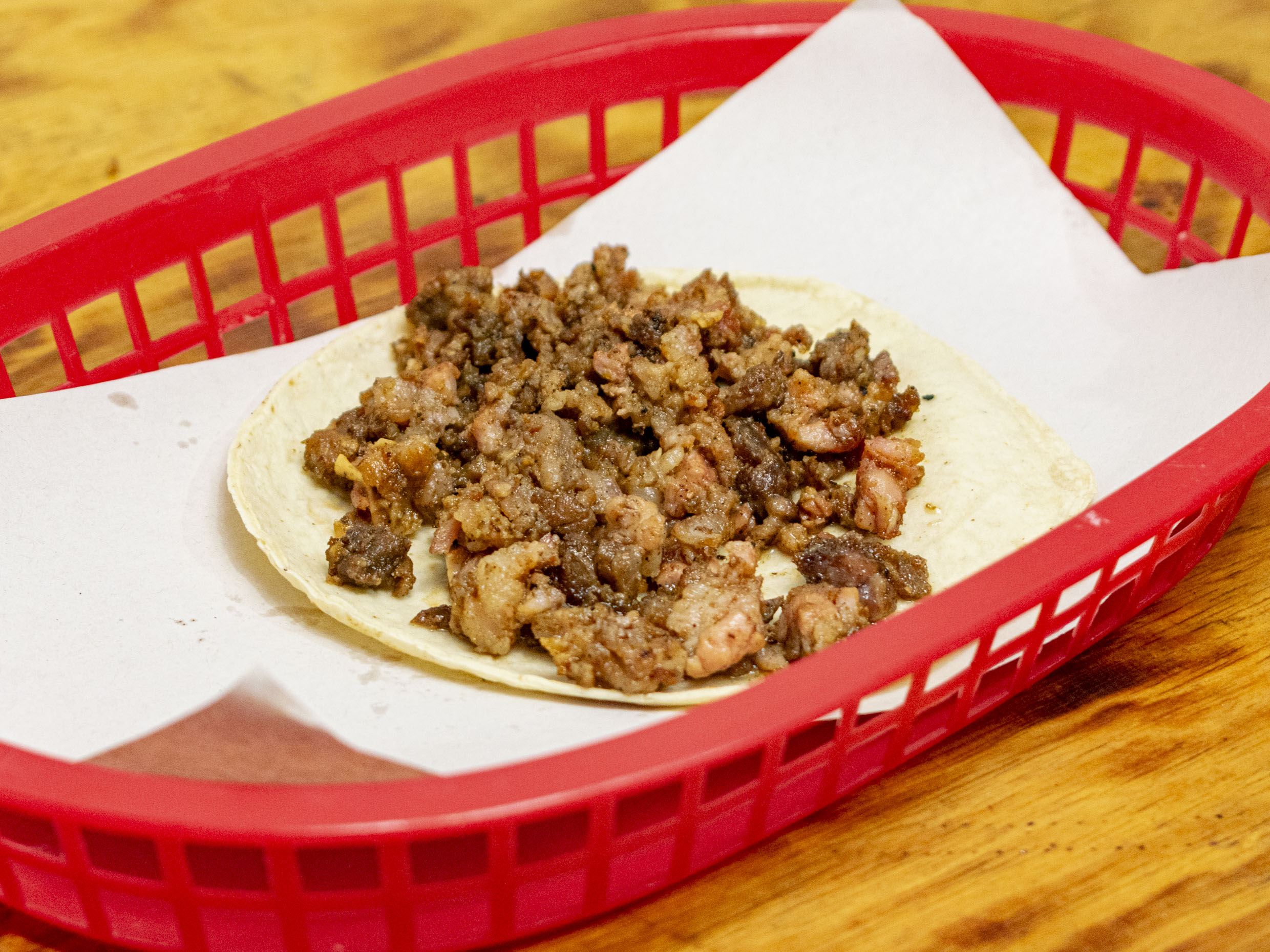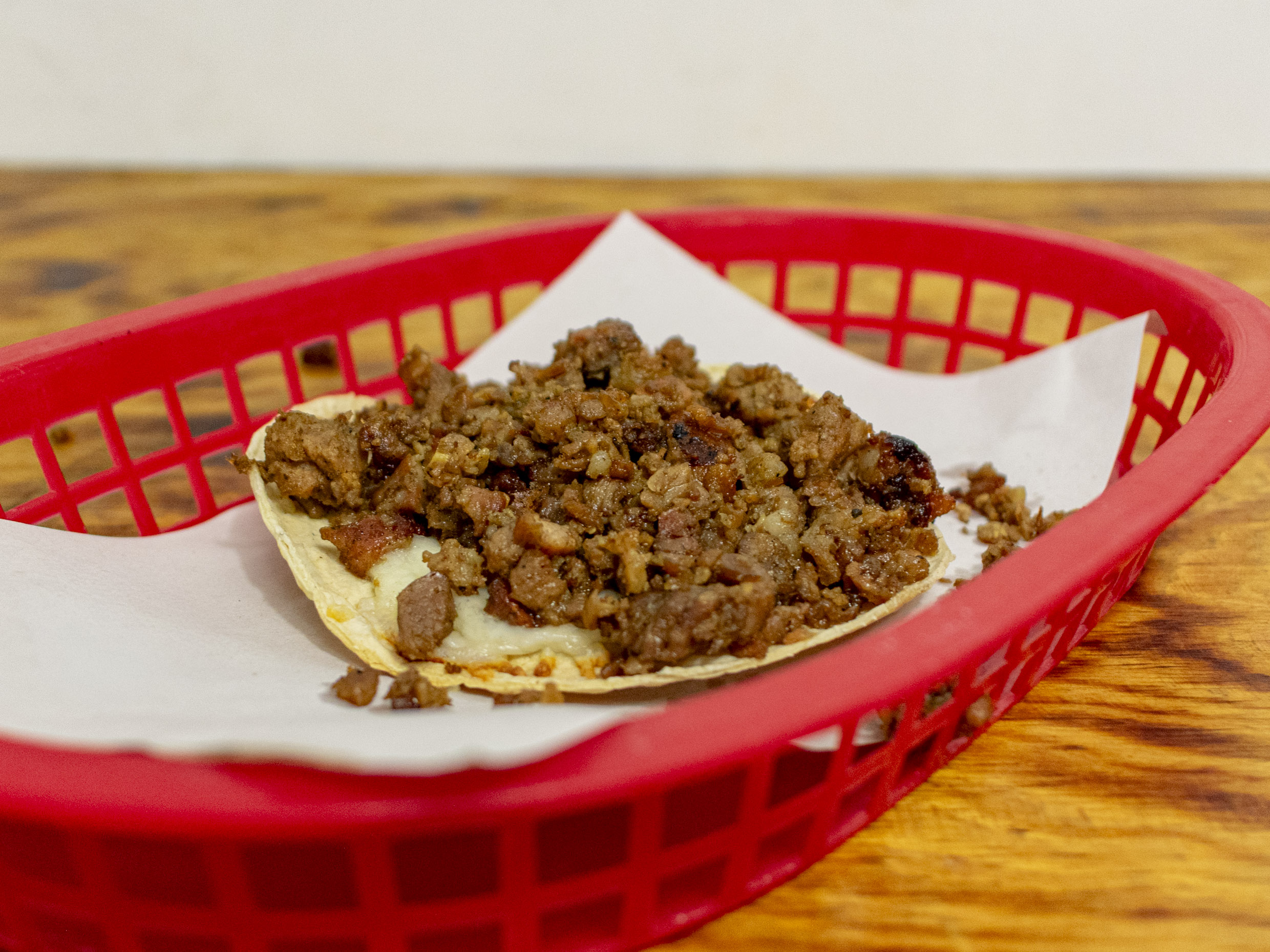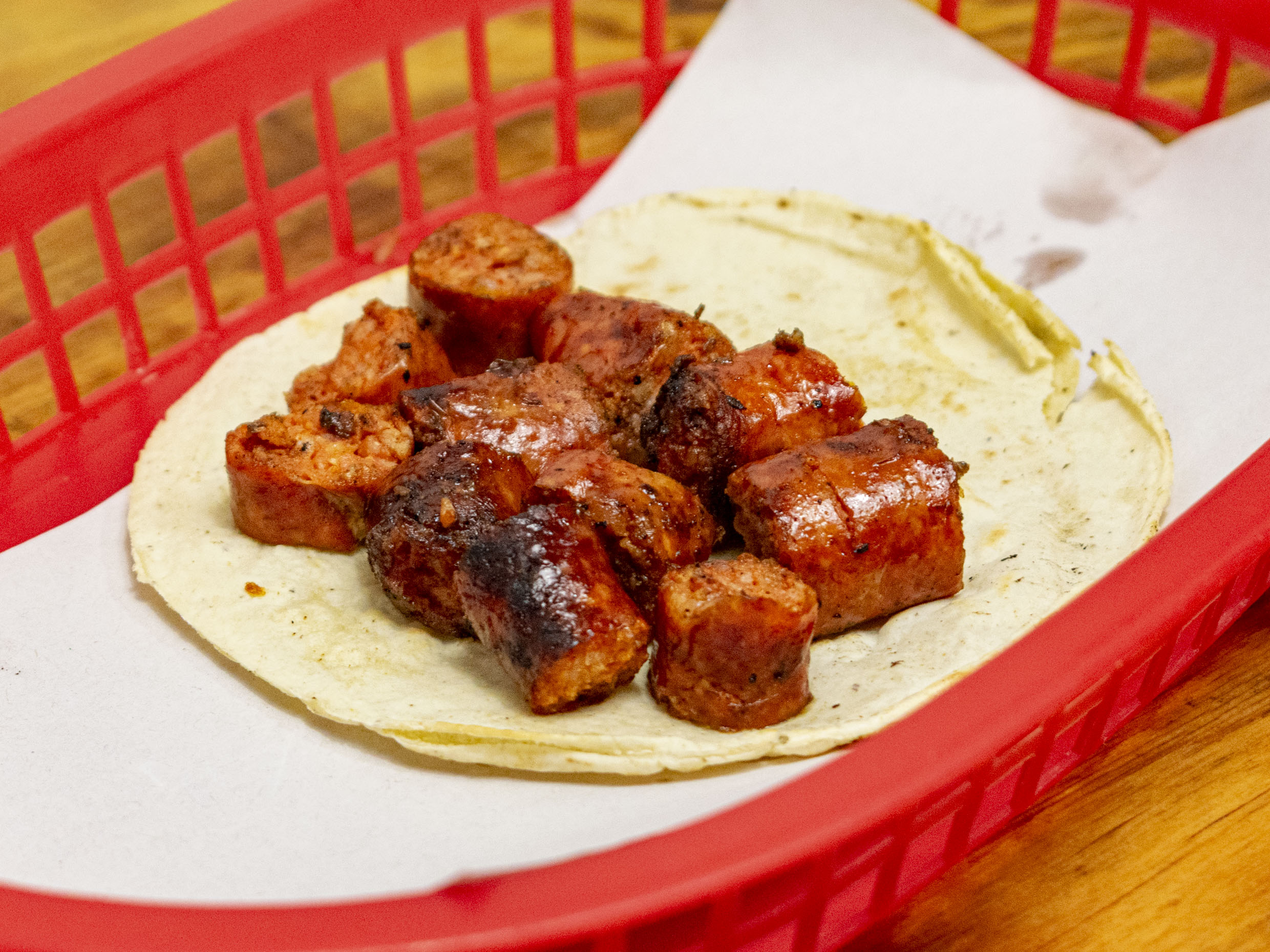 500 Gramos de costillas en crudo antes de cocinar, tortilla de maíz, 2 quesadillas de maíz chicas, cebolla asada, salsa y una salchicha asada.
