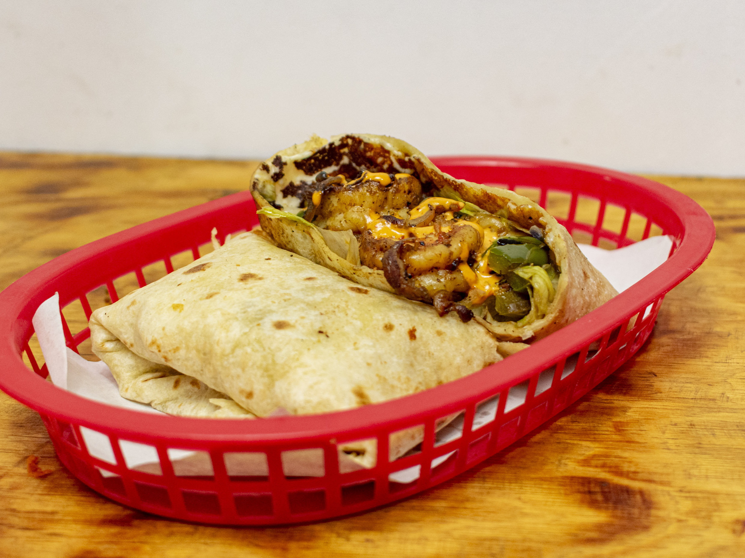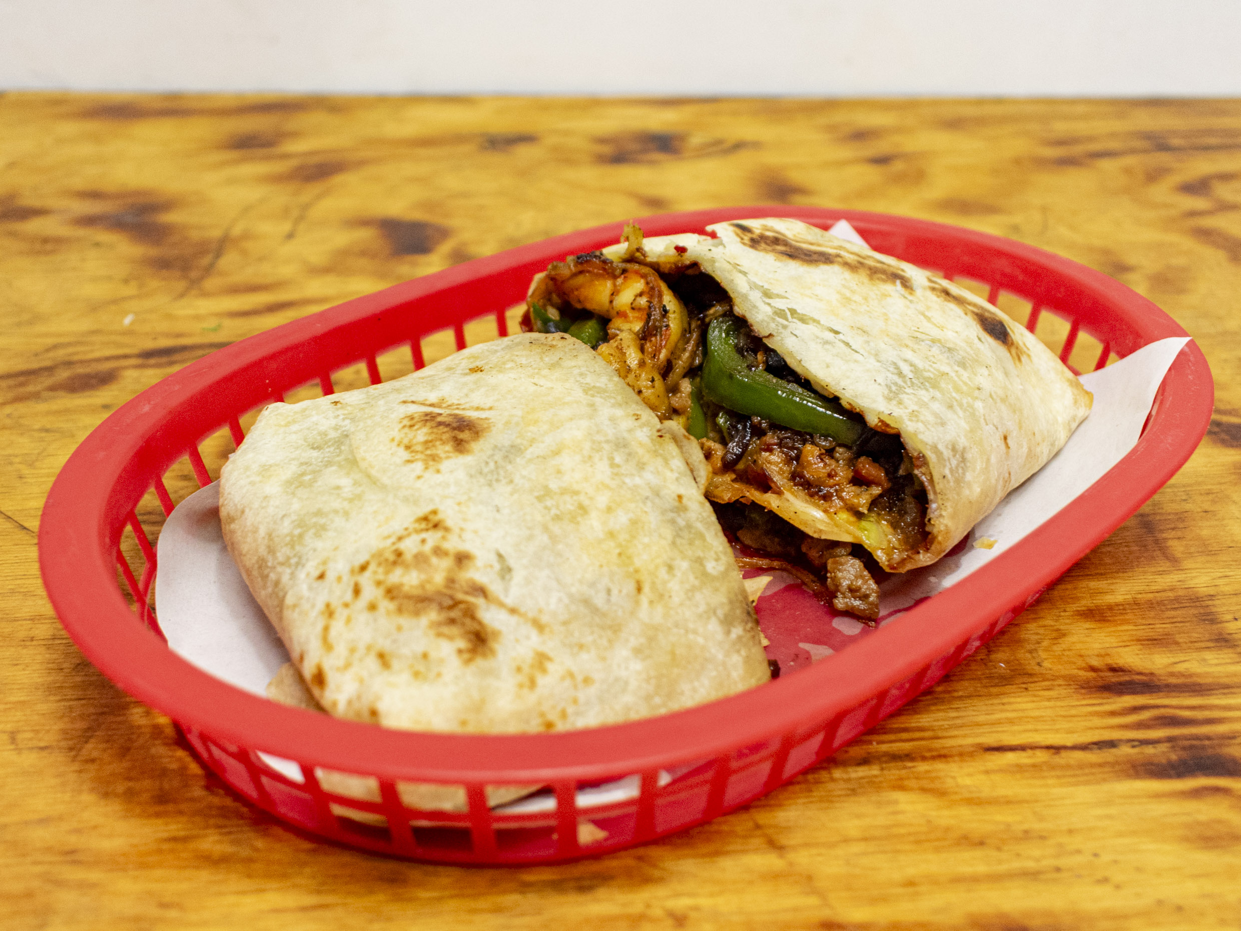 Tortilla de harina con camarón, carne asada, morrón, lechuga y aderezos.