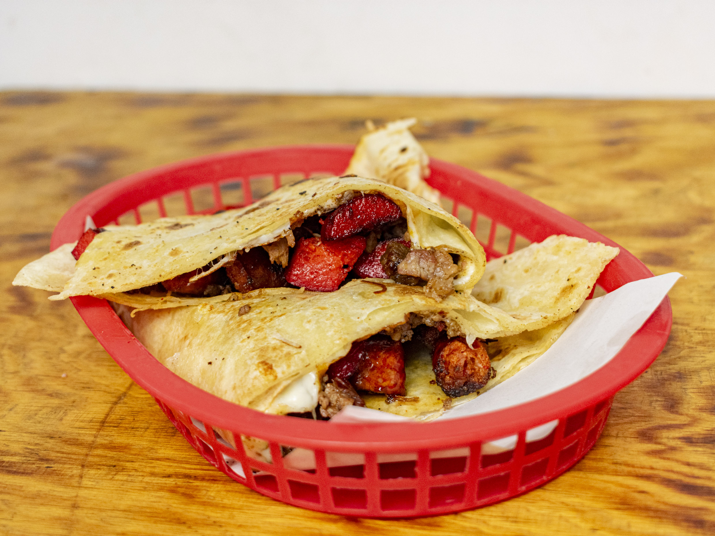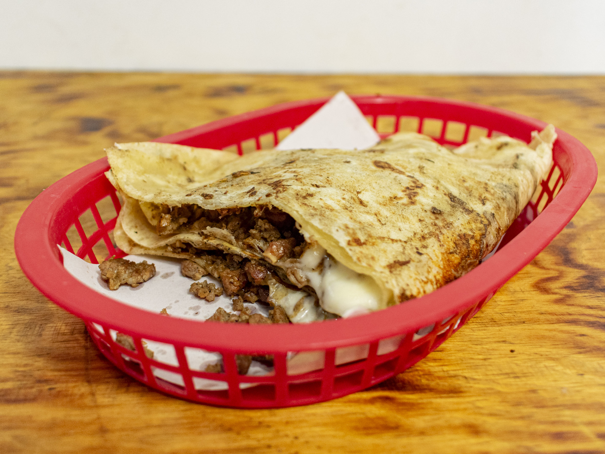 Quesadilla de asada y salchicha con tortilla de harina grande.
