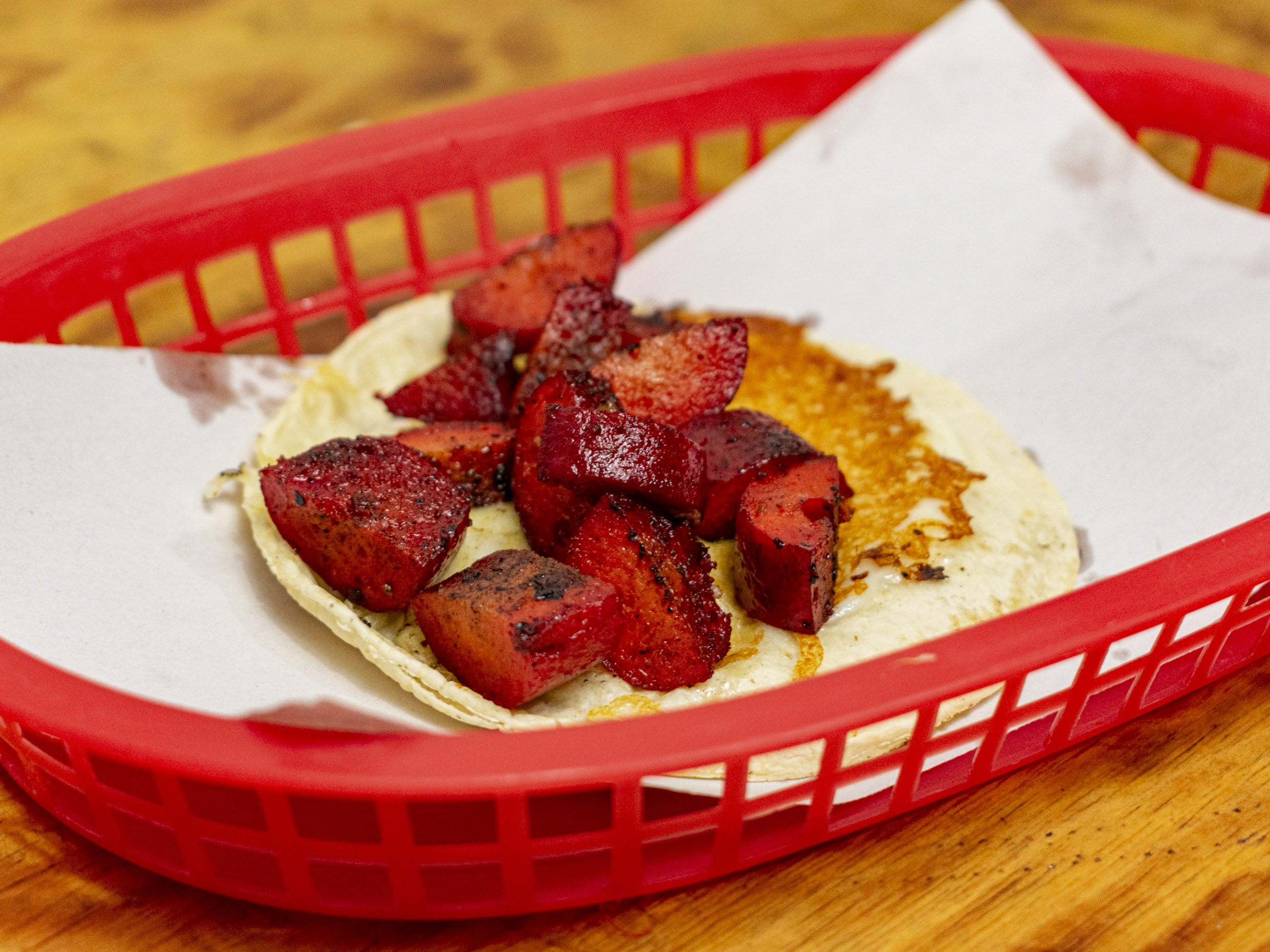 4 Piezas de taco de carne asada con tortilla de maíz tamaño regular (incluye verduras y salsas). Orden personal.