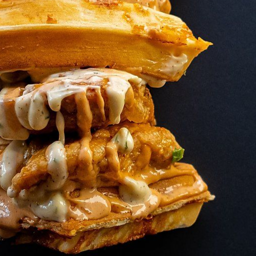 Delicioso y esponjoso waffle sándwich con aderezo de la casa, crujiente pechuga de pollo, tocino frito con un toque de queso cheddar.