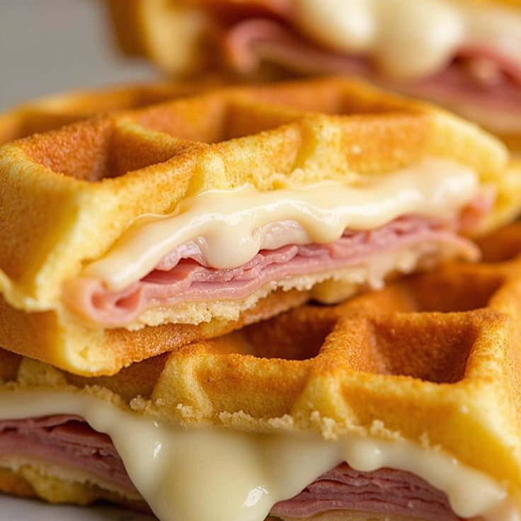 Delicioso y esponjoso waffle sándwich con aderezo de la casa, pechuga de pavo, tocino frito y queso manchego con un toque de queso cheddar.