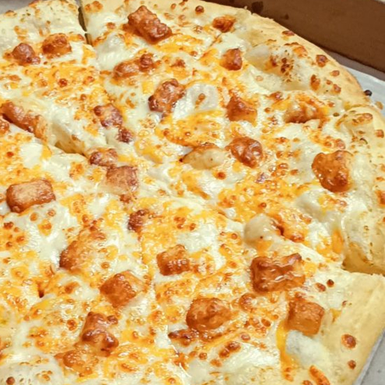 Deliciosa pizza con base de waffle y mantequilla con ajo, bañado en salsa receta de la casa, doble mix de quesos con un toque de salsa cheddar.
