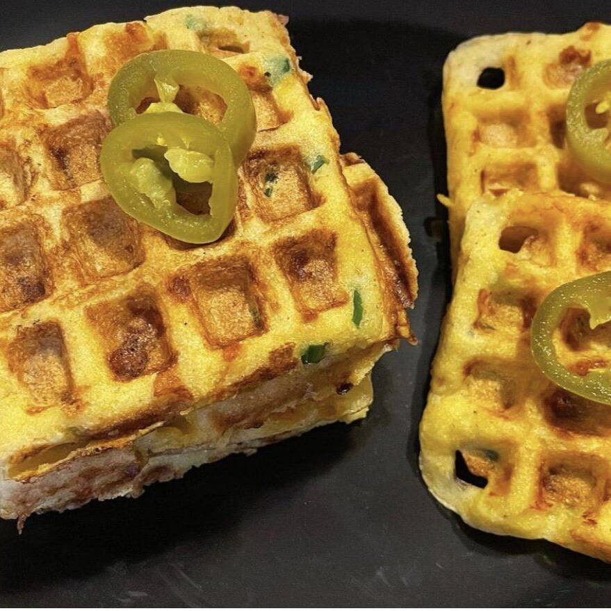 Delicioso y esponjoso waffle sándwich con aderezo de la casa, chorizo, jalapeños, queso manchego y un toque de queso cheddar.