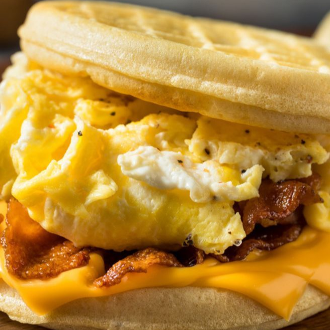 Delicioso y esponjoso waffles sándwich con aderezo de la casa, omelette de huevito, tocino frito y un toque de queso cheddar.