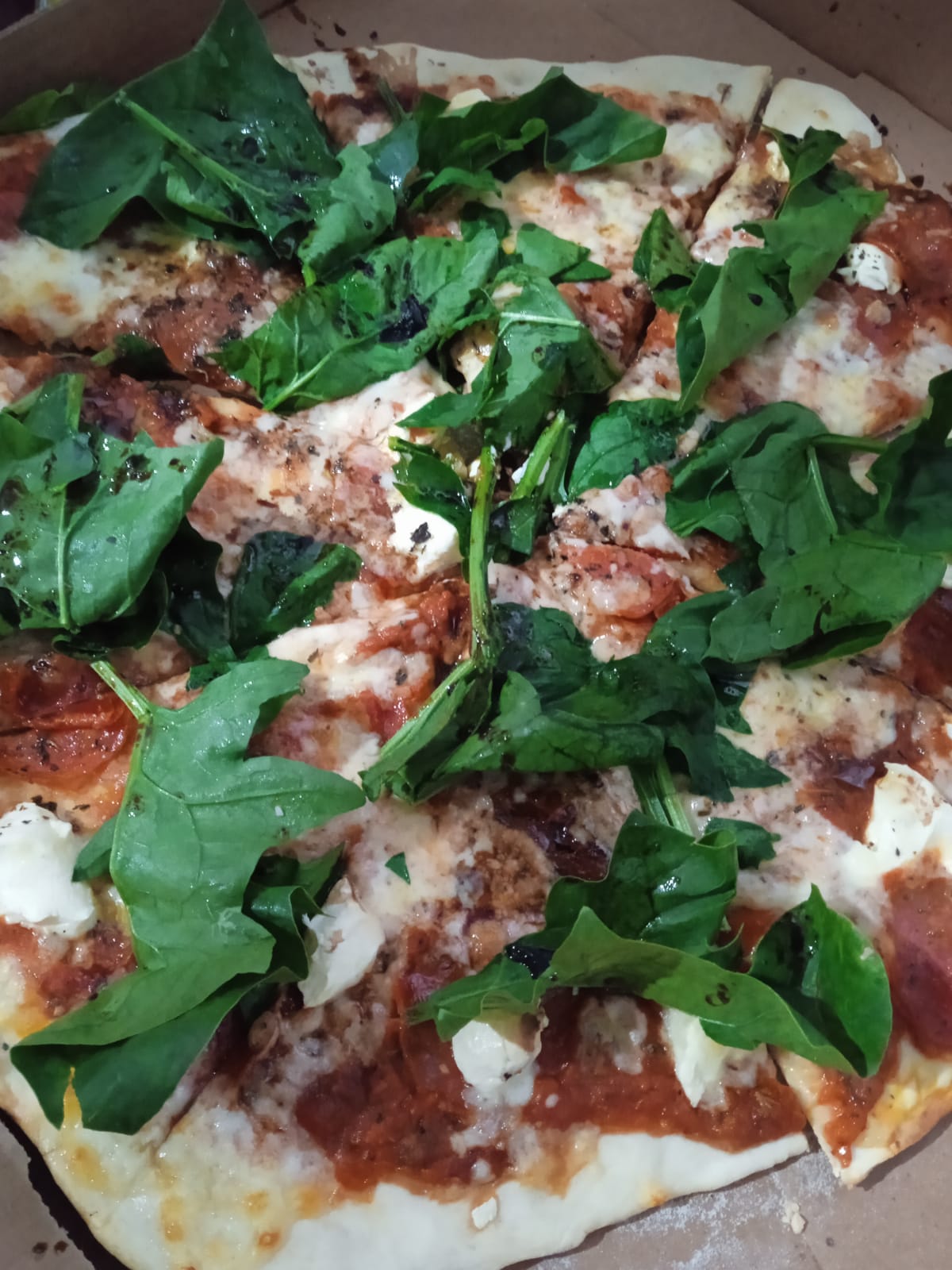 Espinaca cruda con vinagreta balsámica, queso crema y pepperoni.