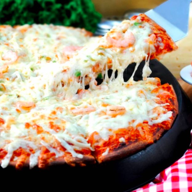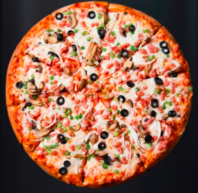 Jamón, champiñones, aceitunas negras, morrón verde y cebolla blanca.