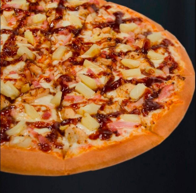Pollo a la plancha, tocino, piña, salsa bbq.