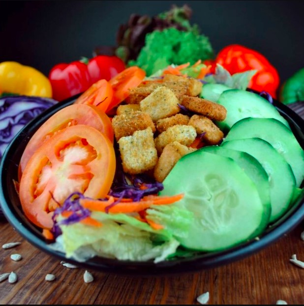 Lechuga orejona, repollo morado, pepino, crutones, tomate y zanahoria.