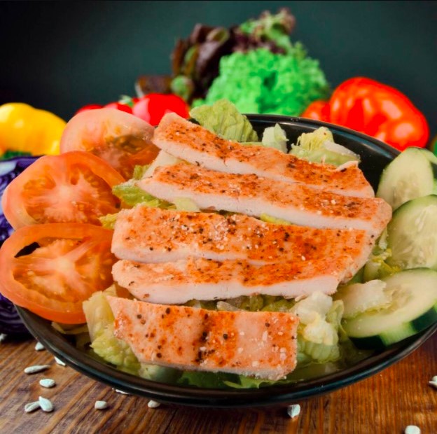 Pechuga de pollo a la parrilla, lechuga orejona, tomate, pepino y queso parmesano.