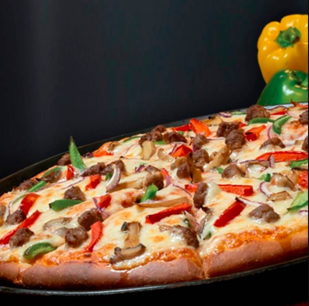 Morrón verde, morrón rojo, cebolla morada, salchicha italiana y champiñones.