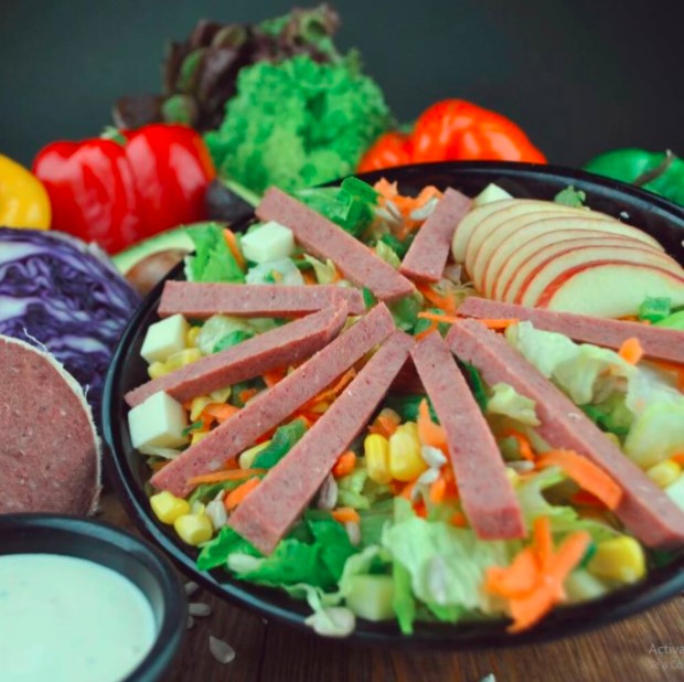 Lechuga orejona, queso menonita, elote, semilla de girasol, salchicha menonita, manzana, zanahoria y pimiento morrón.