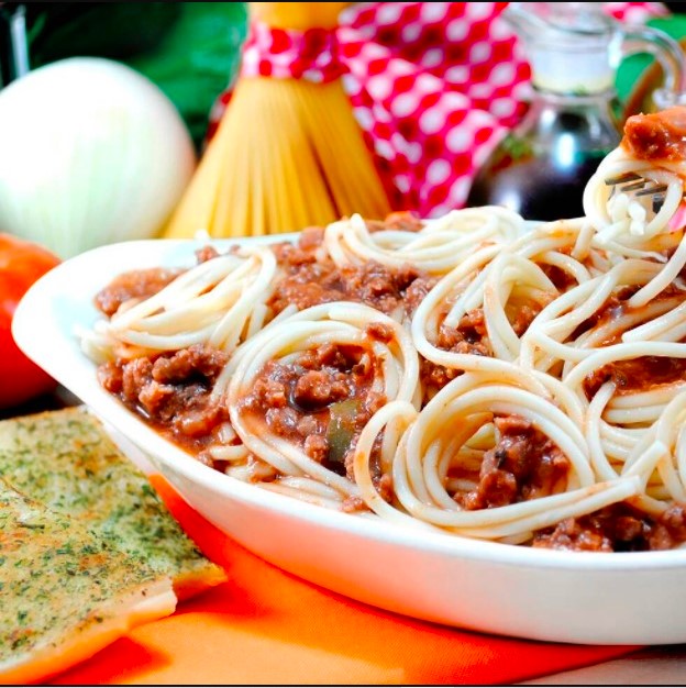Spaghetti acompañado de salsa de la casa, carne molida y pan de ajo.