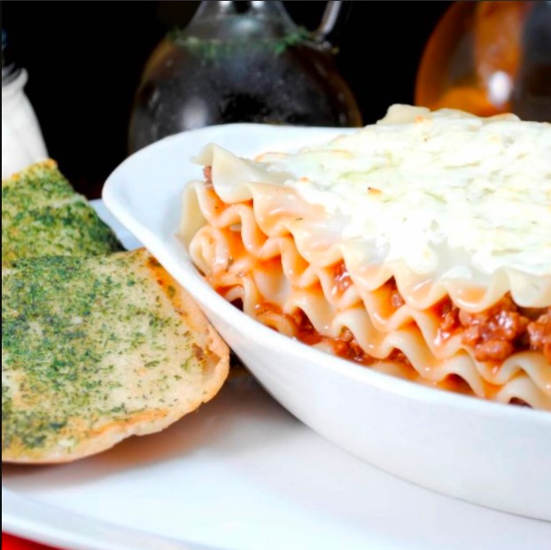 Pasta capeada con queso al gratín, salsa de la casa, carne molida y pan de ajo.