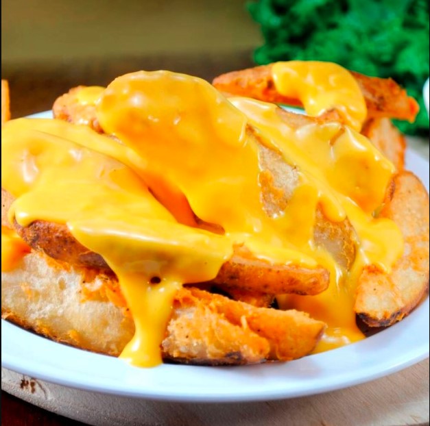 Papas a la francesa bañadas con queso amarillo, chile curtido y crema menonita.