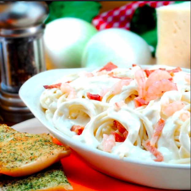 Spaghetti en salsa Alfredo, con tocino y camarones, acompañado de pan de ajo.