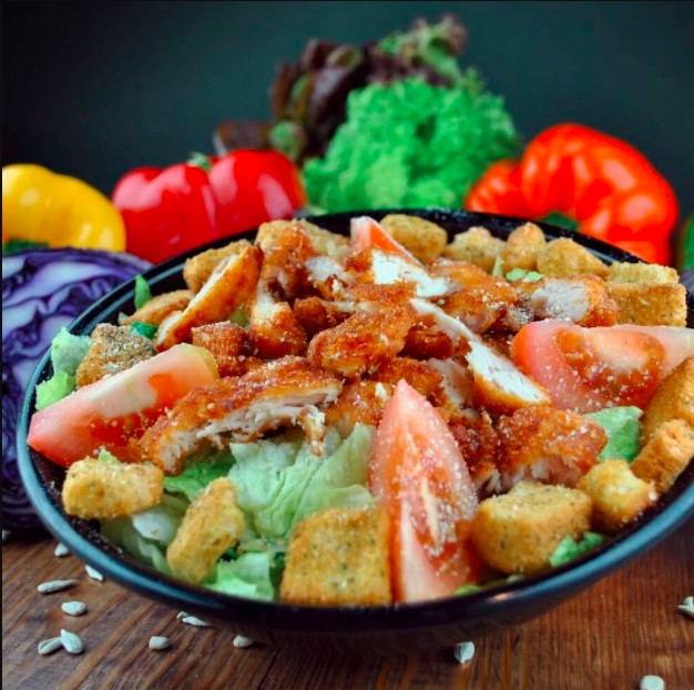 Lechuga orejona, tomate, crutones, queso parmesano y pechuga de pollo empanizada.