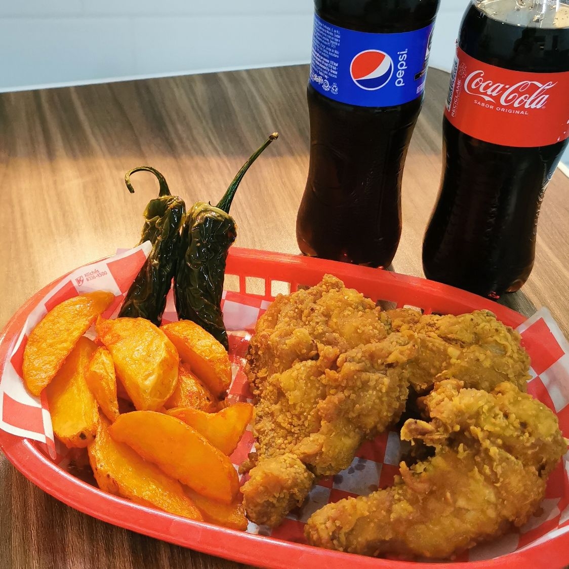 .300 gr. de pierna y muslo, .100 gr. de papas gajo,bebida, salsa, chiles toreados, tortillas y totopos.