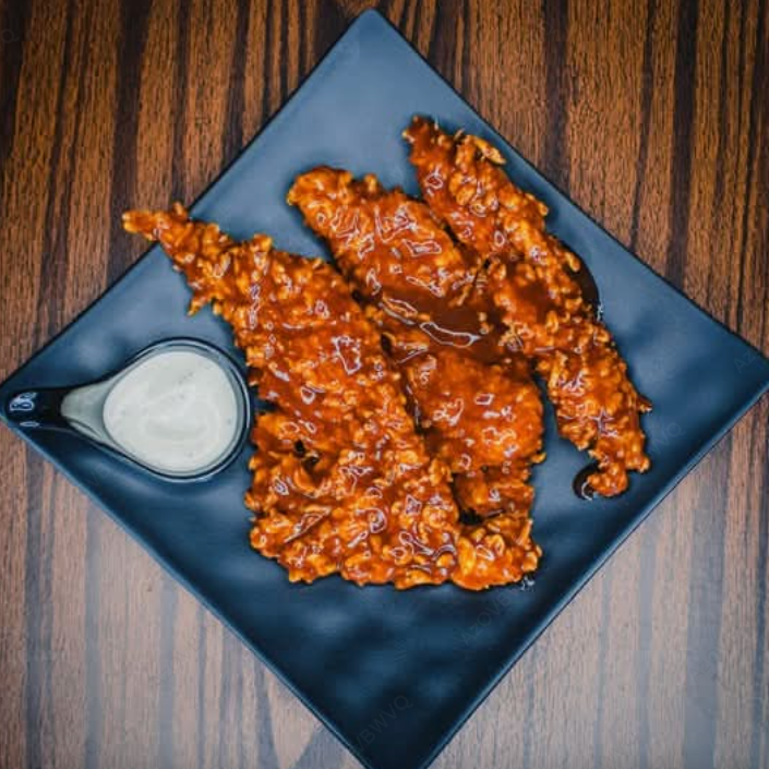 3 pzas De tiras crujientes de pechuga de pollo bañadas en tu salsa favorita, incluye papas crisscut.