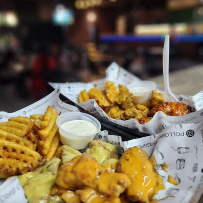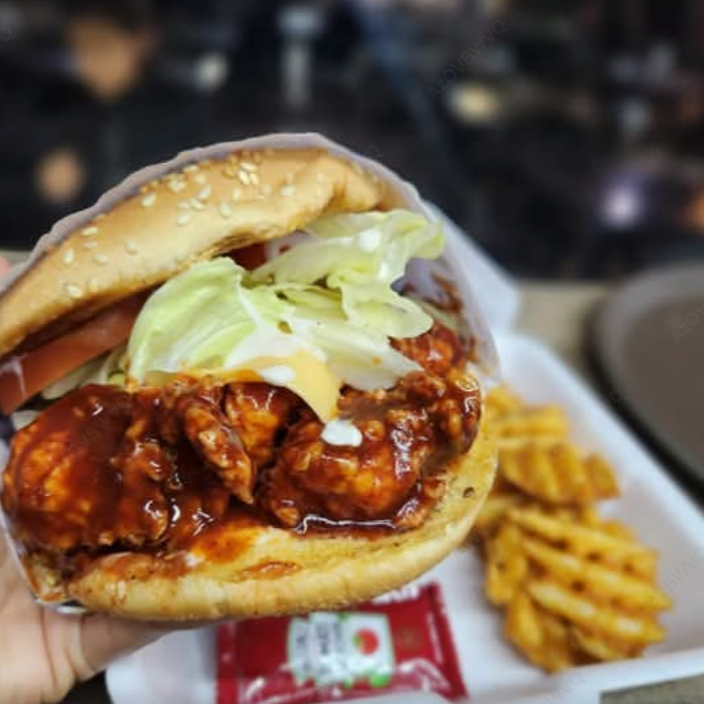 Boneless bañados en tu salsa favorita, lechuga, queso, tomate y aderezo ranch (receta secreta de la casa), incluye papas crisscut.