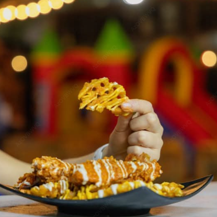 Papas crisscut con queso amarillo, dos tenders de pechuga de pollo, bañados en salsa buffalo (receta secreta de la casa), aderezo ranch (receta secreta de la casa) y trocitos de tocino, todos los paquetes incluyen papas crisscut