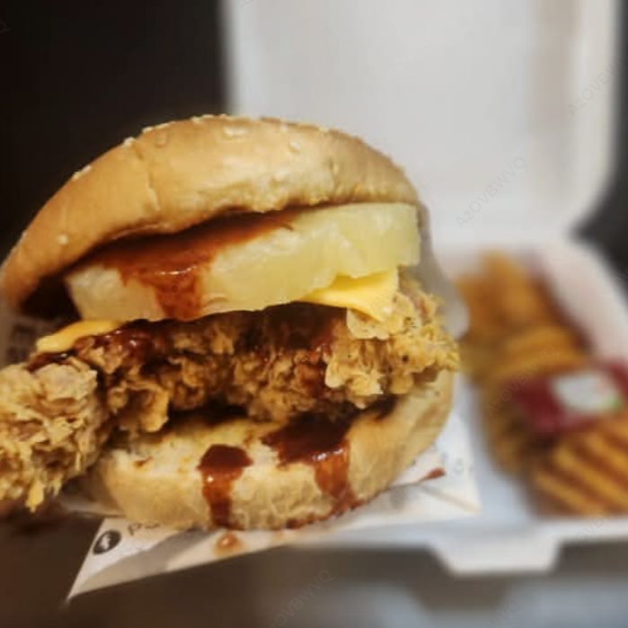 Hamburguesa original, 1 tender de pechuga de pollo bañado en tu salsa favorita, papas crisscut y aderezo ranch (receta secreta de la casa), todos los paquetes incluyen papas crisscut (papas en forma de rejilla o waffle), (no incluye refresco).