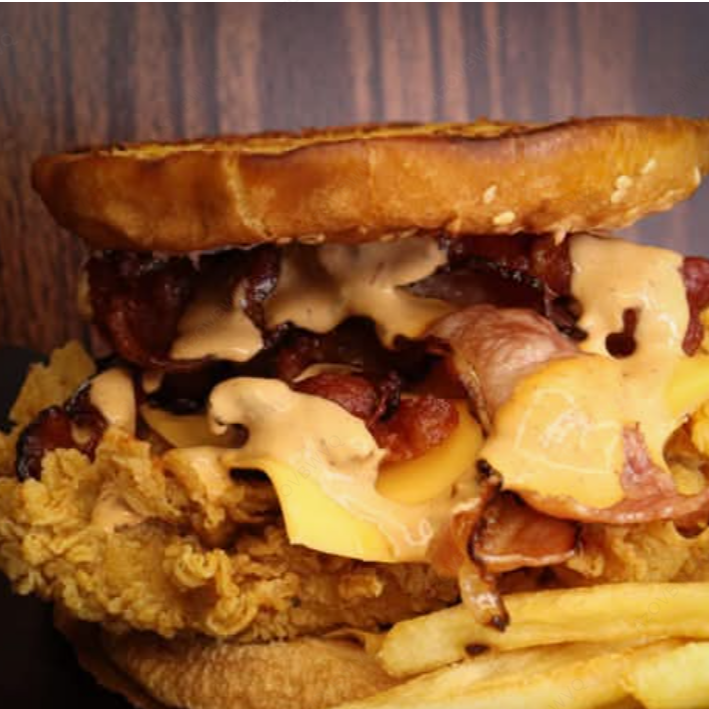 Pan al revés con mantequilla, doble queso, doble tocino y aderezo de chipotle (receta secreta de la casa), Incluye papas crisscut