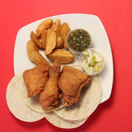 3 Piezas de pollo frito, papas gajo, tortillas, salsa y chiles toreados.