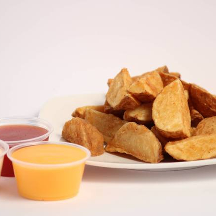 Papa empanizada por kilogramo, incluye mayonesa, queso y cátsup en vaso.