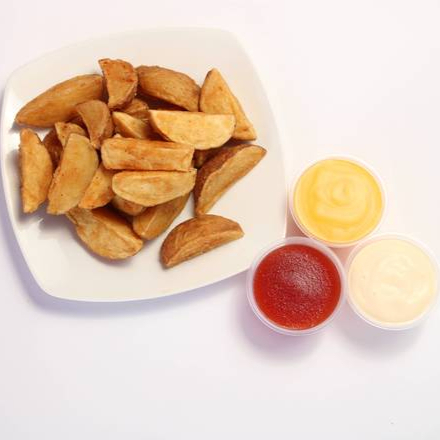 Medio kilogramo de papas gajo, incluye mayonesa, cátsup y queso amarillo.