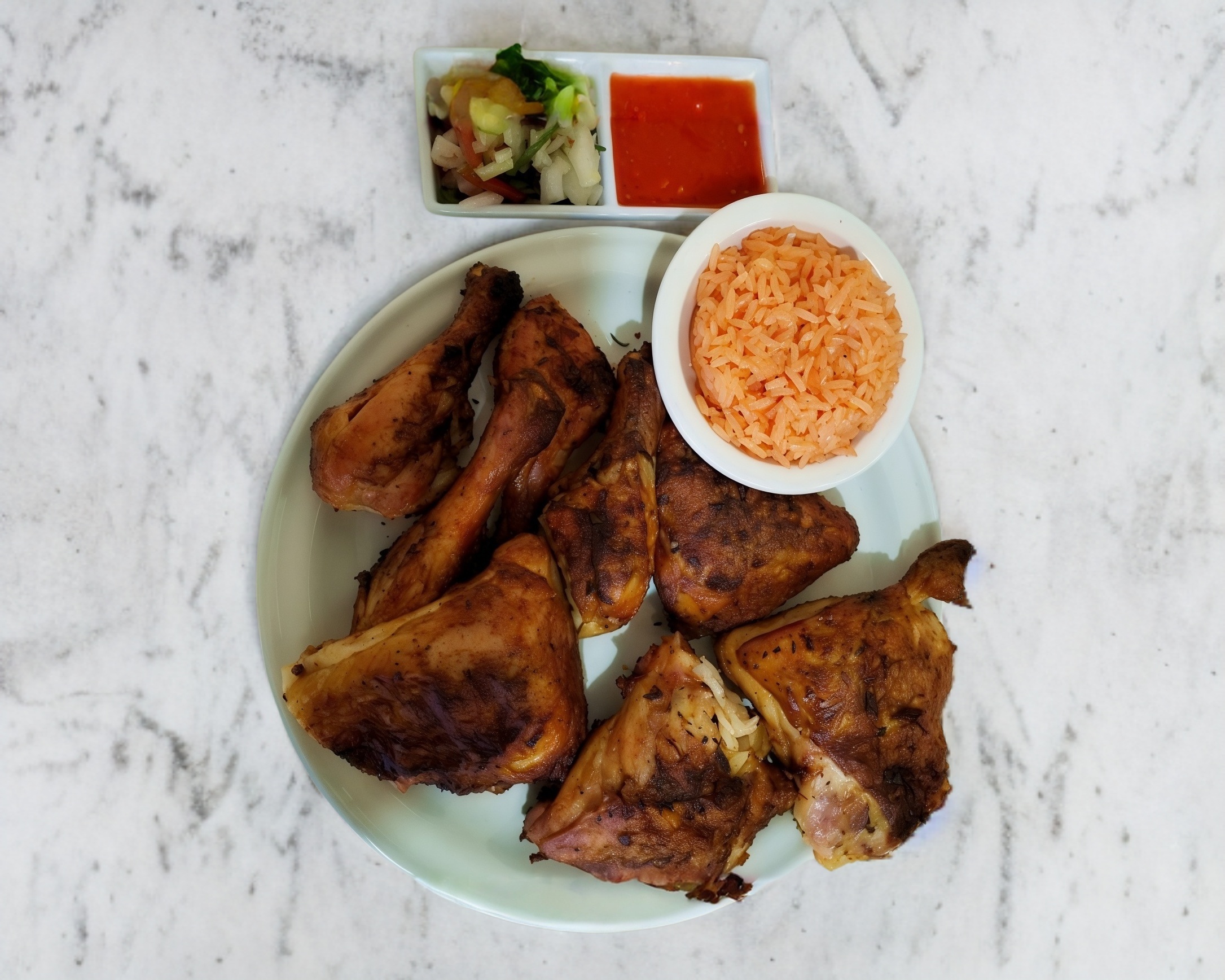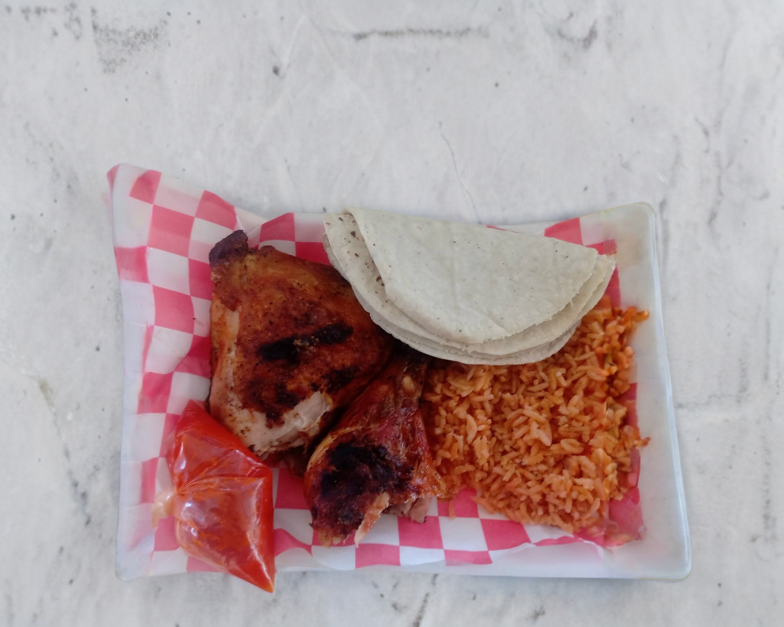 medio pollo acompanado de arroz, salsa, tortillas y pico de gallo