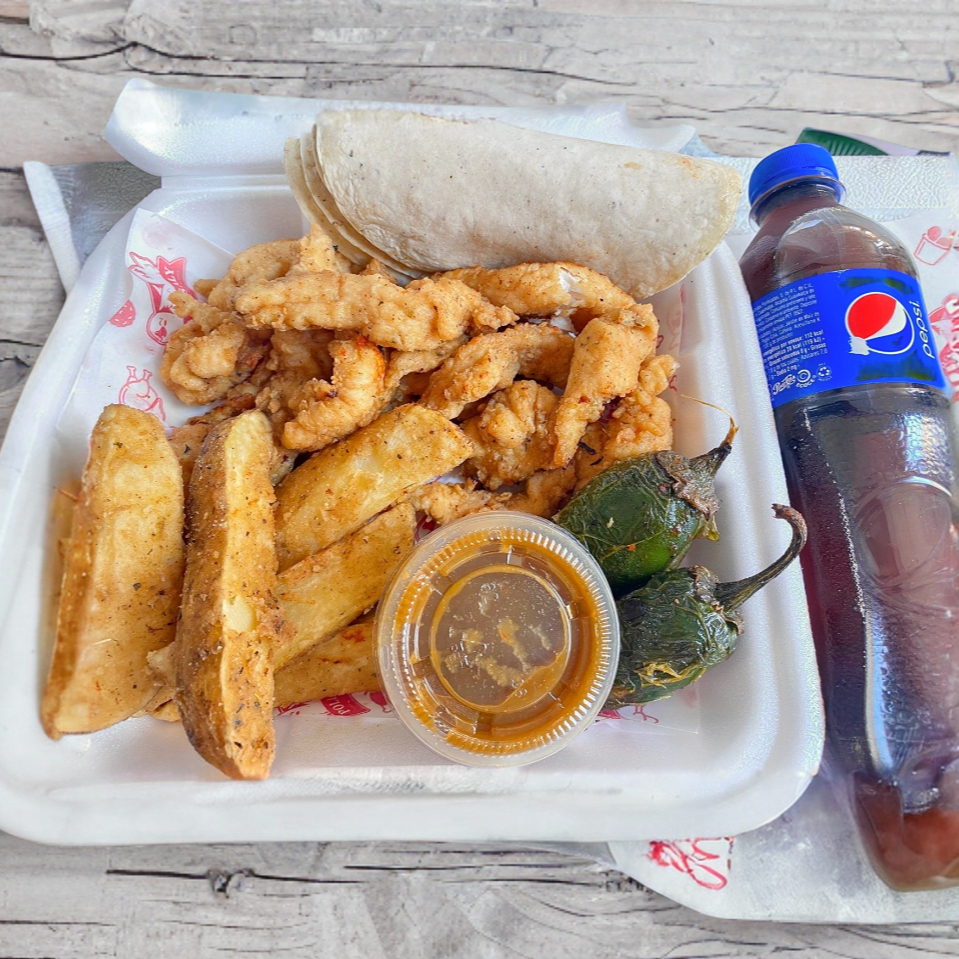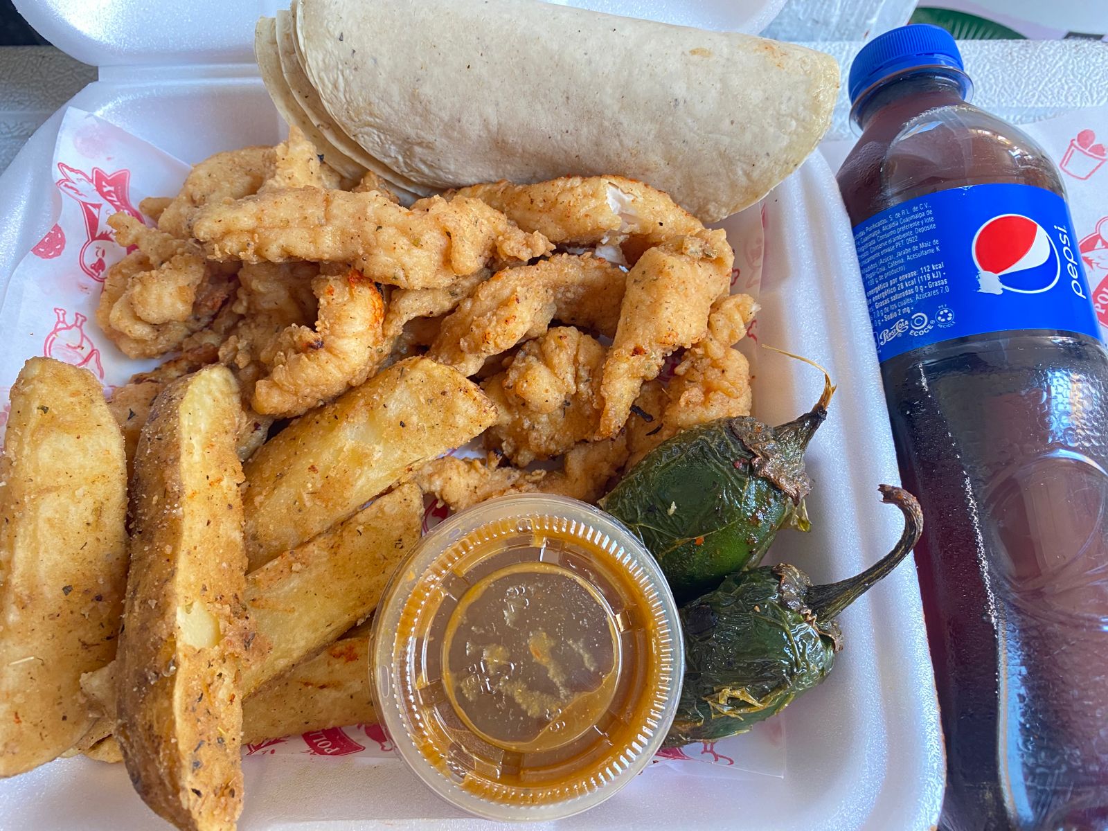 250 g Fajitas Empanizada + Papas Gajo (5 pzas) + Complementos (Tortillas, salsa y chiles toreados) + PEPSI 400ml
