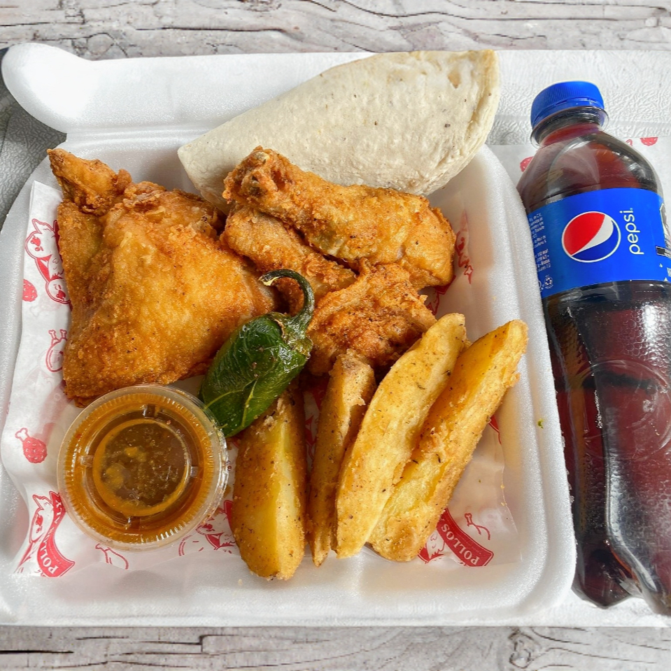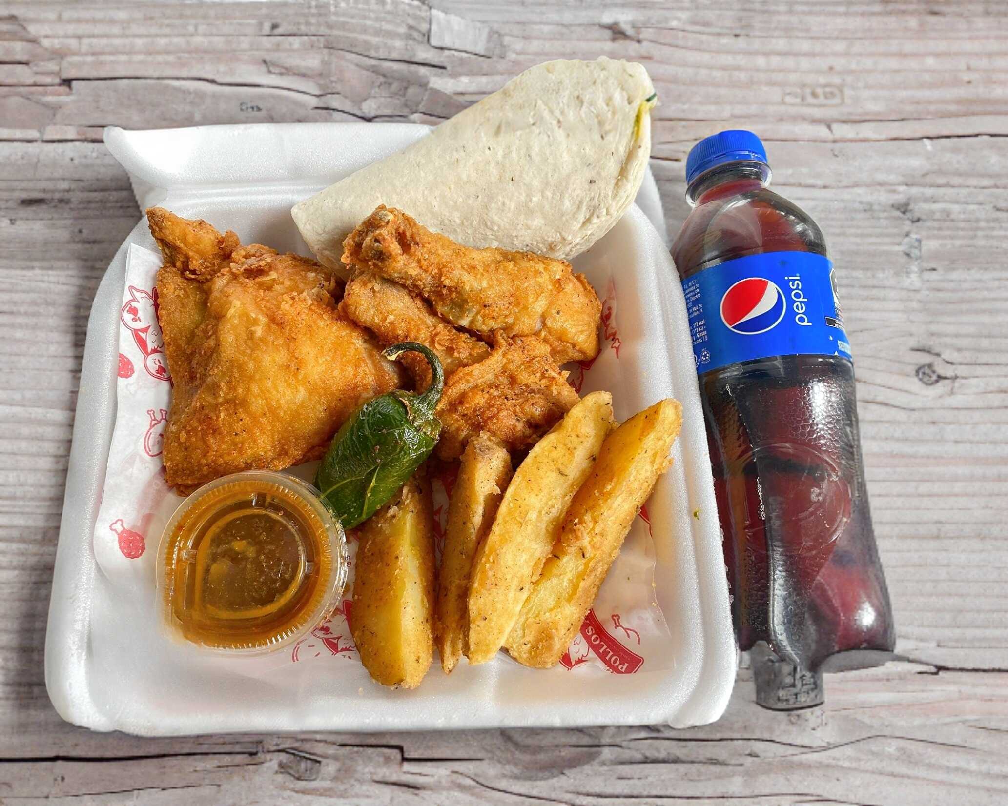 3 Pz Pollo Empanizado (1 muslo y 2 piernas) + Papas Gajo (5 pzas) + Complementos (Tortillas, salsa y chiles toreados) + PEPSI 400ml