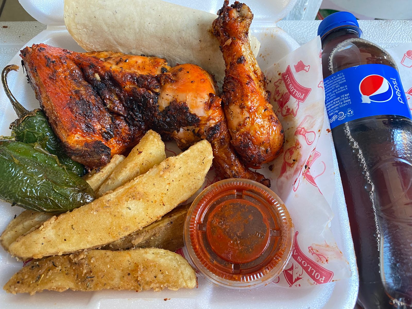 3 Pz Pollo Asado (1 muslo y 2 piernas) + Papas Gajo (5 pzas) + Complementos (Tortillas, salsa y chiles toreados) + PEPSI 400ml