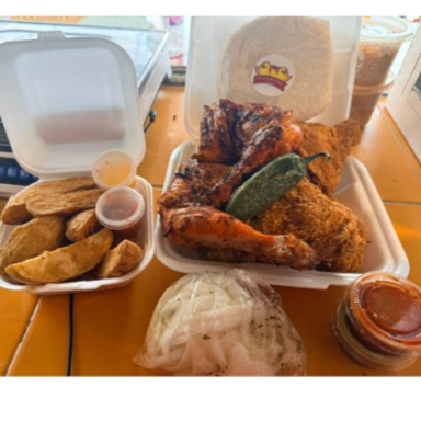 medio kilo de pollo asado medio kilo de empanizado medio de tortillas refresco de 1.5 cebollaen vinagre salsas chile toreado media orden de papas