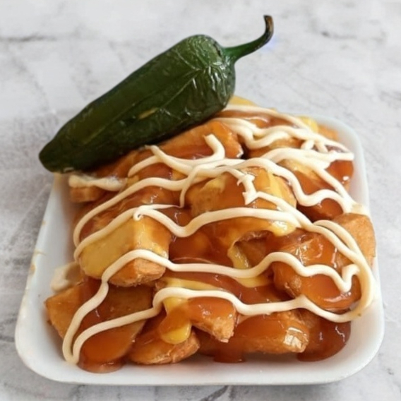 1kg Papa gajo empanizada receta de la casa, porciones de cátsup y mayonesa.