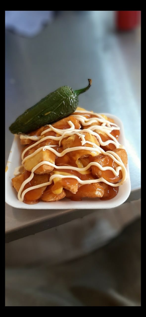 Papa empanizada receta de la casa, acompañado con cátsup y mayonesa..