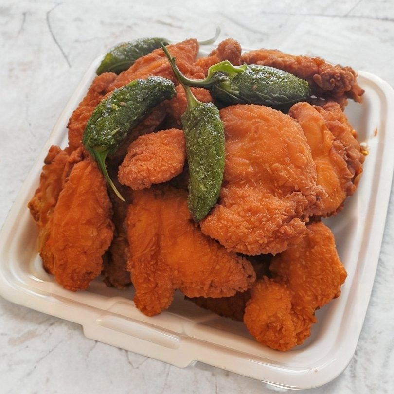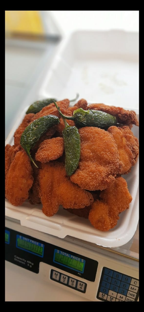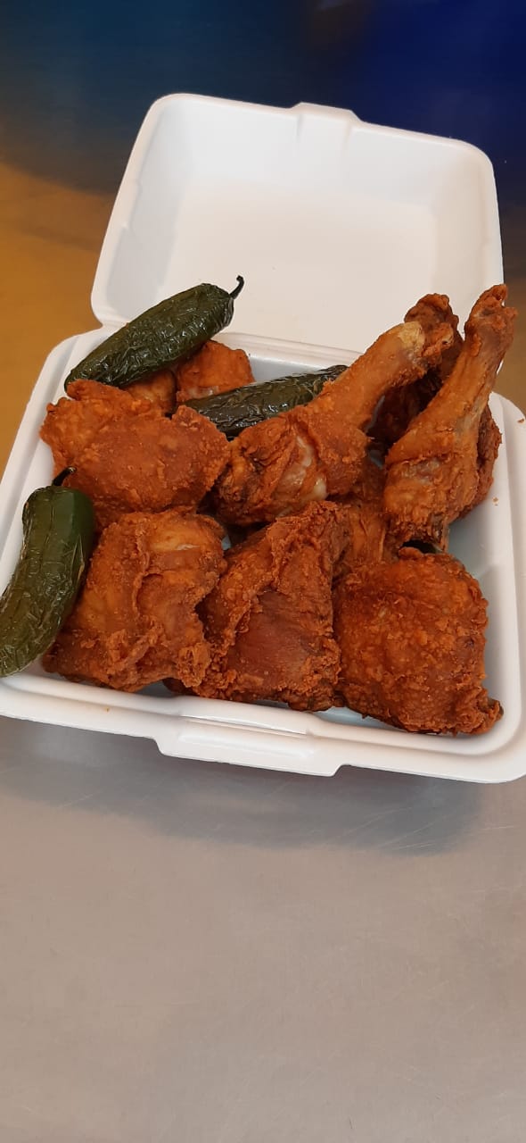 1kg Muslo y pierna empanizada receta de la casa acompañado con chiles toreados, salsa y totopos.