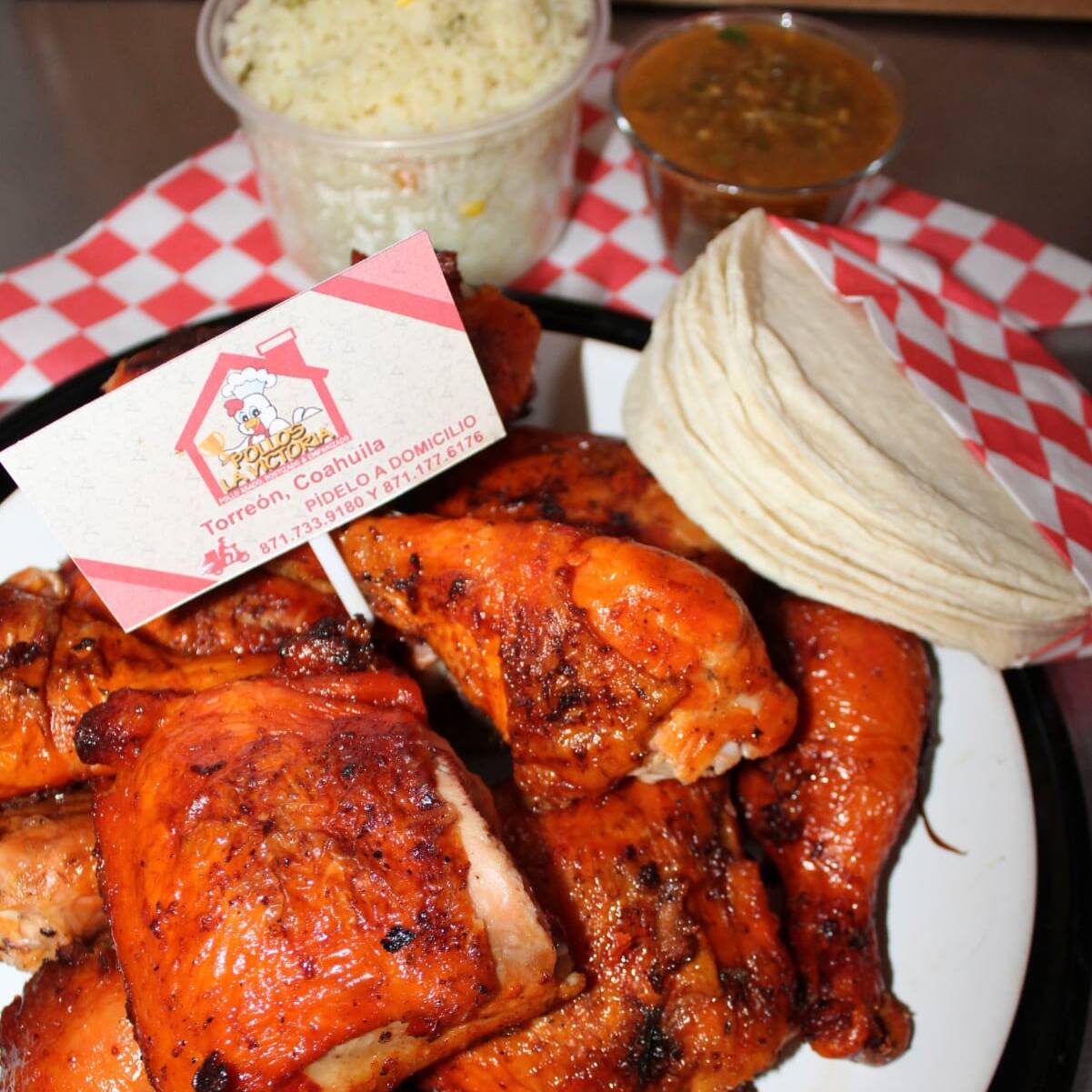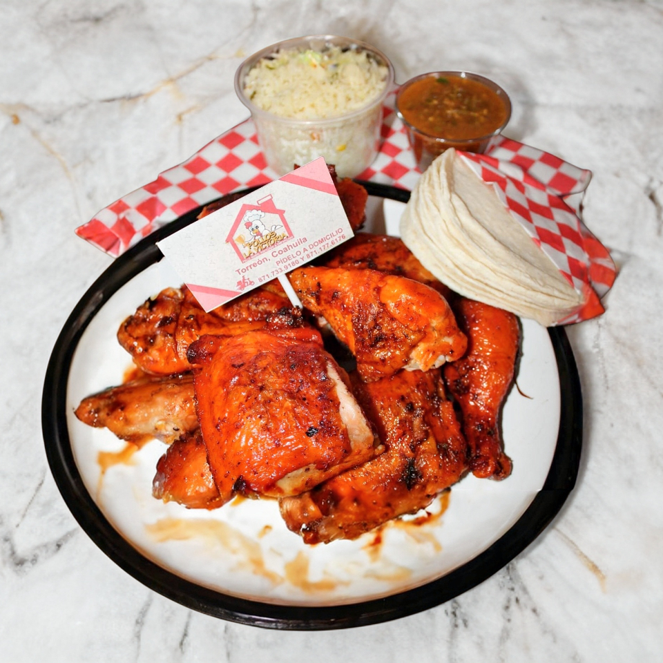 UNA PIERNA Y MUSLO PECHUGA Y ALA, ACOMPAÑADO DE ARROZ TORTILLAS Y SALSA DE LA CASA