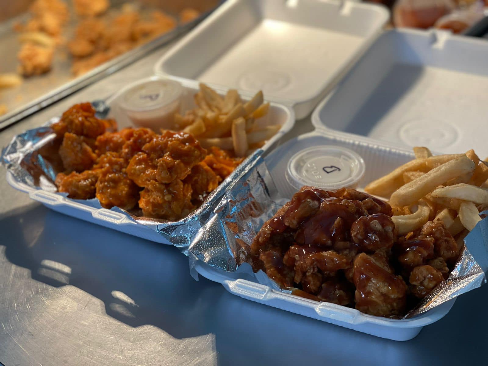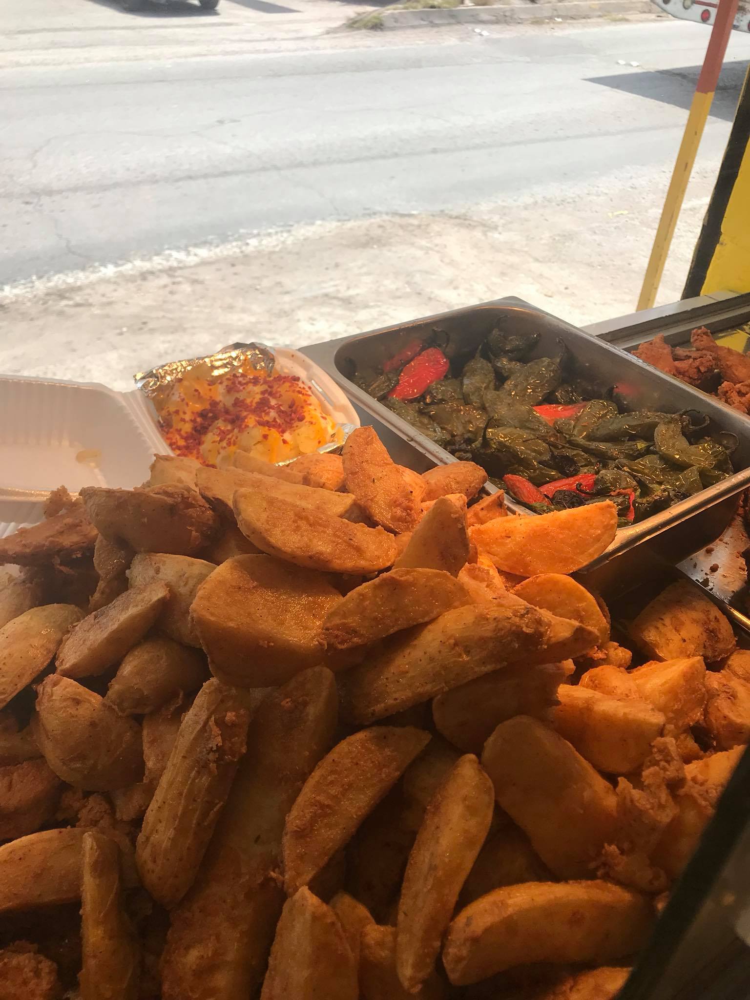 Con 3 aderezos amarillos, 3 cátsup y chiles toreados.