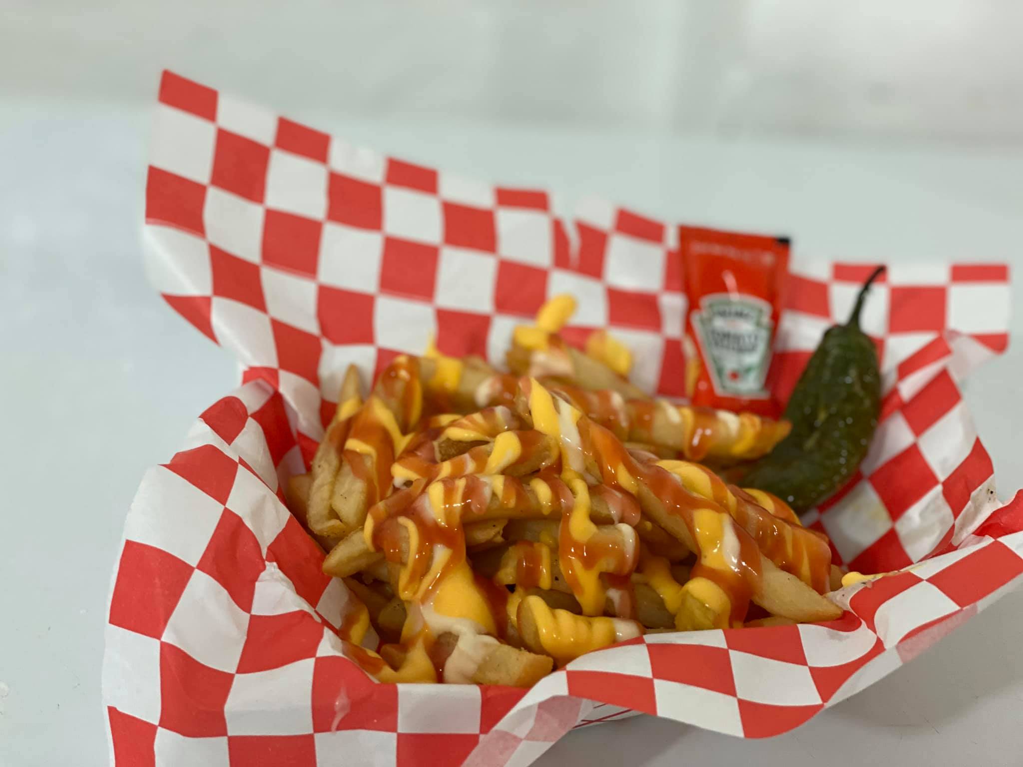 Con 1 aderezo amarillo, 1 cátsup y chiles toreados.