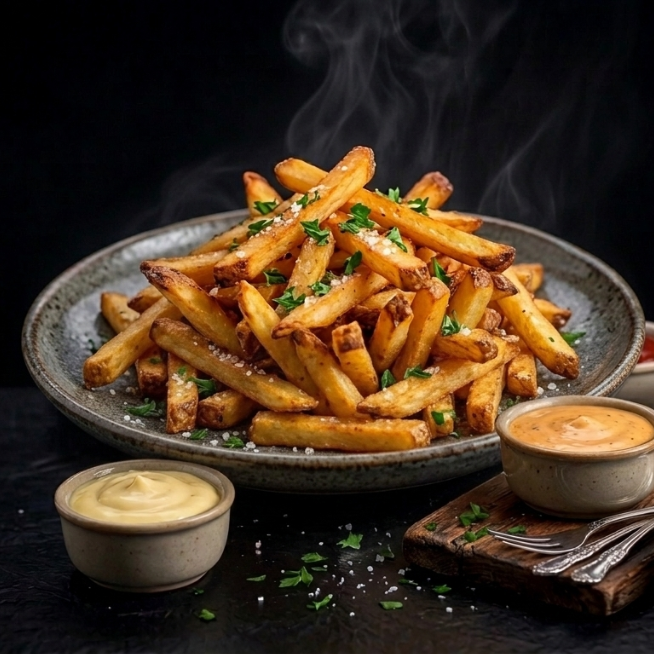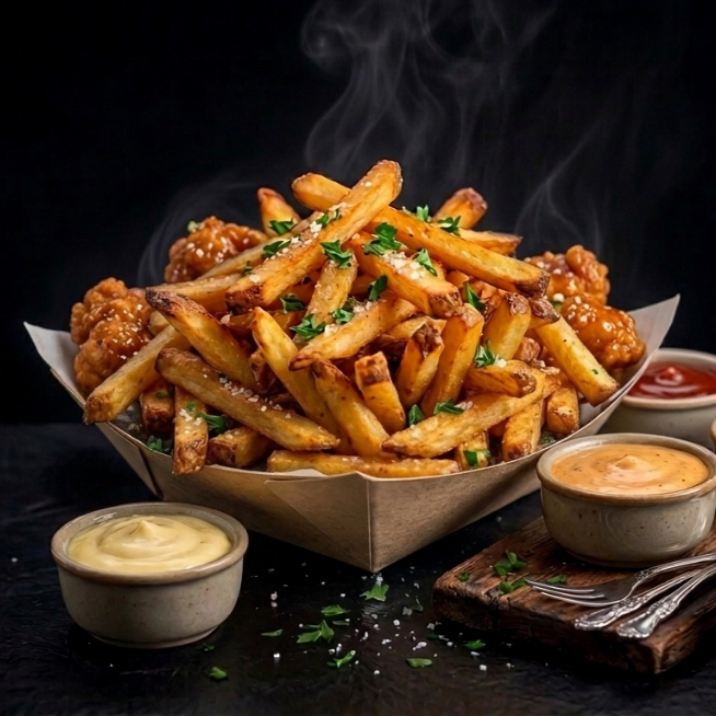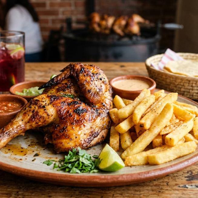 350g de pollo asado con papas a la francesa, cebolla asada, salsa y tortillas