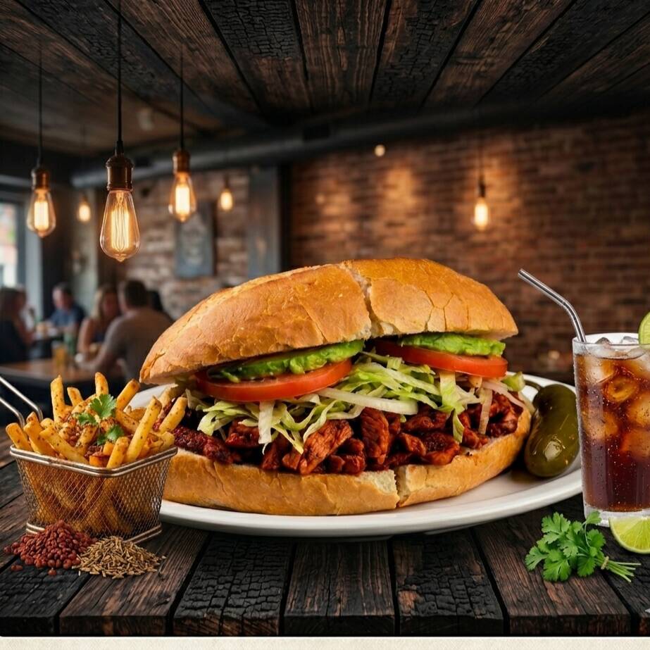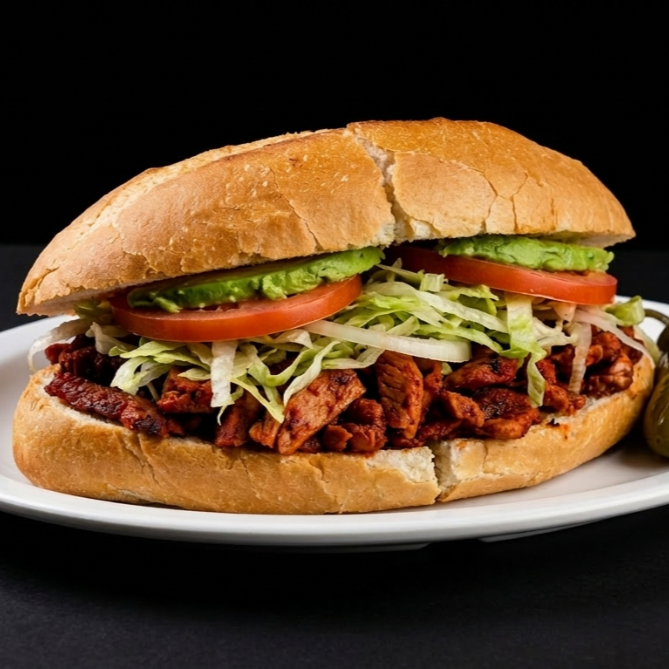 Delicioso lonche de adobada, tomate, cebolla, chile y aguacate