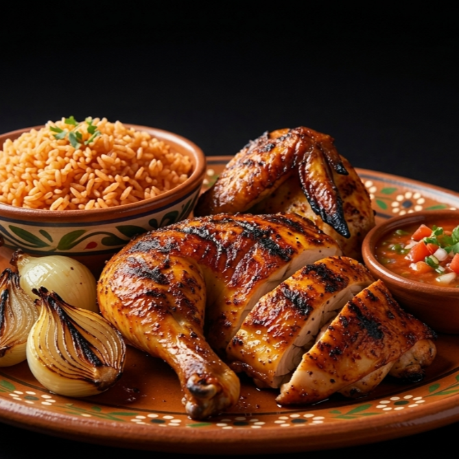Medio Kilo De Pollo Asado, Sopa, Cebolla Asada, Salsa y Tortillas